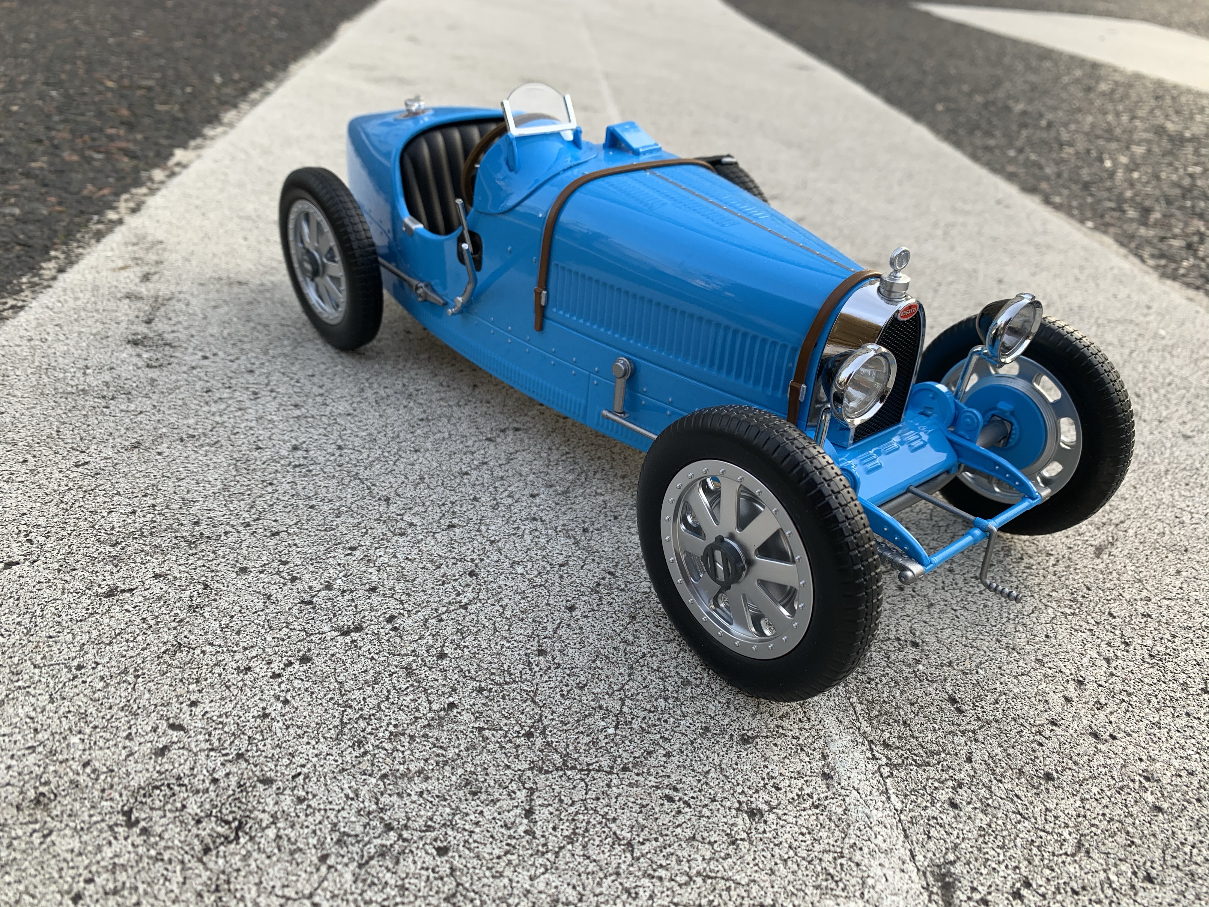 L’habitacle est joliment reproduit quoiqu’un peu trop plastique. Le beau volant et les différents leviers sont très fragiles ! La sellerie est de couleur noire sur la version Bleu Bugatti et de couleur fauve sur la version noire.