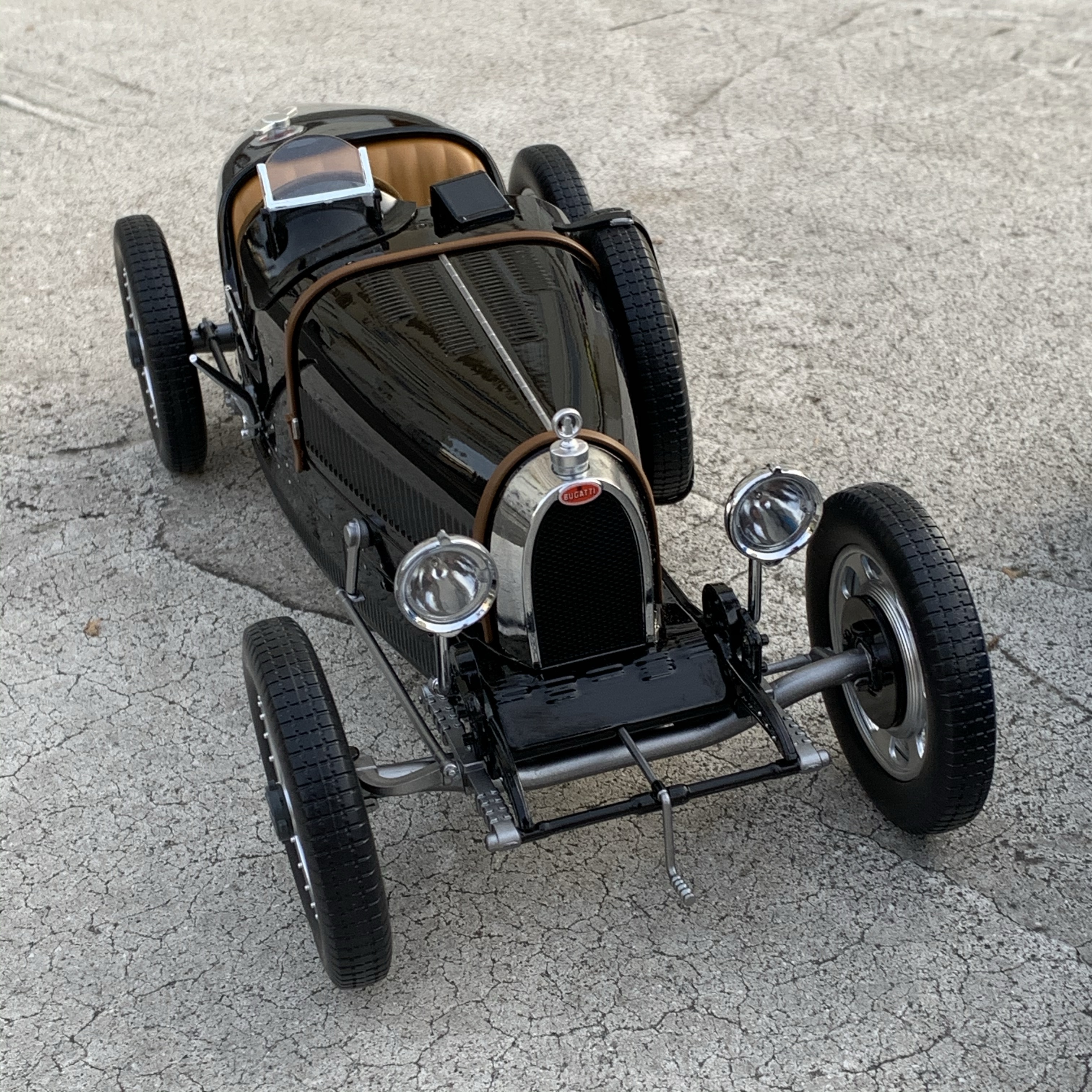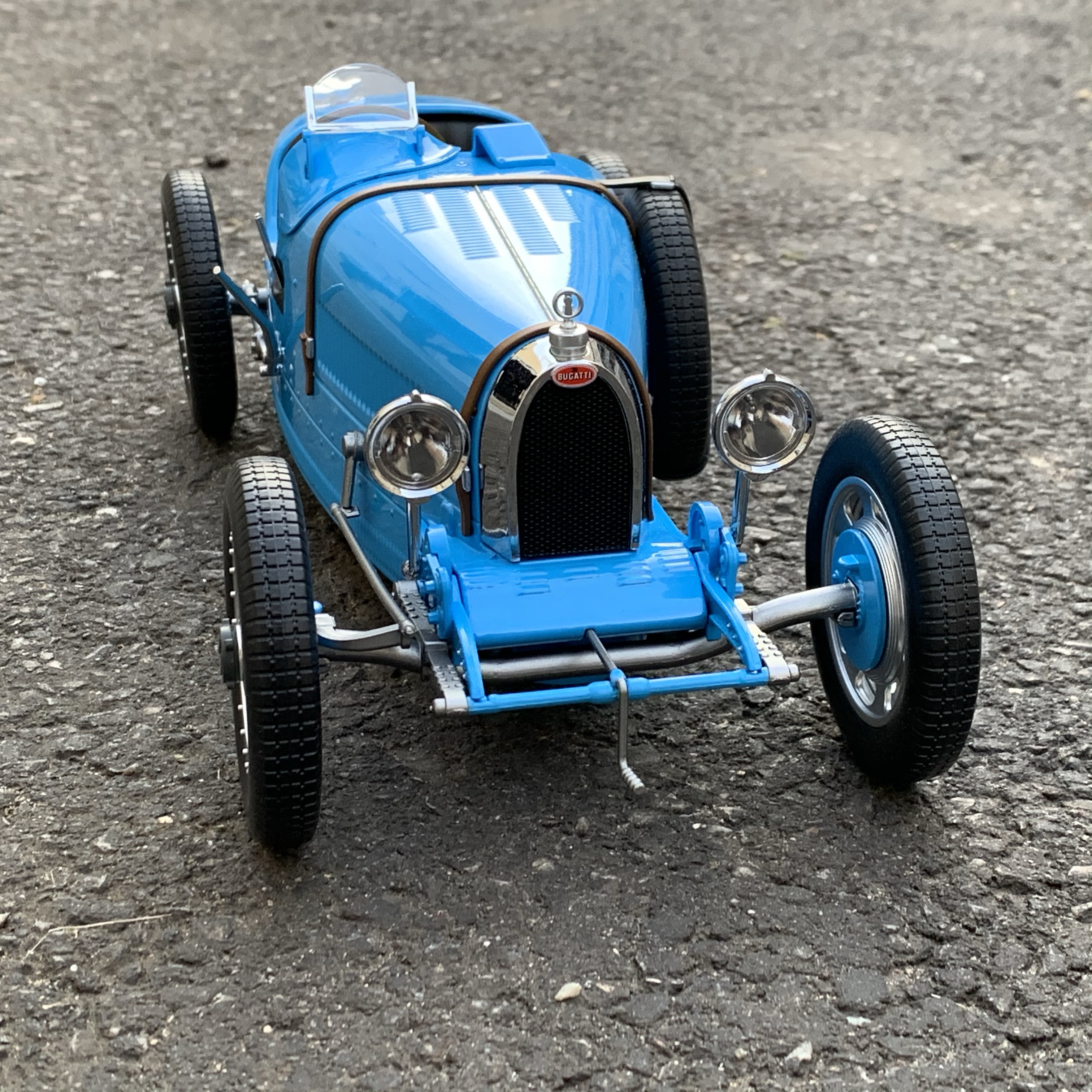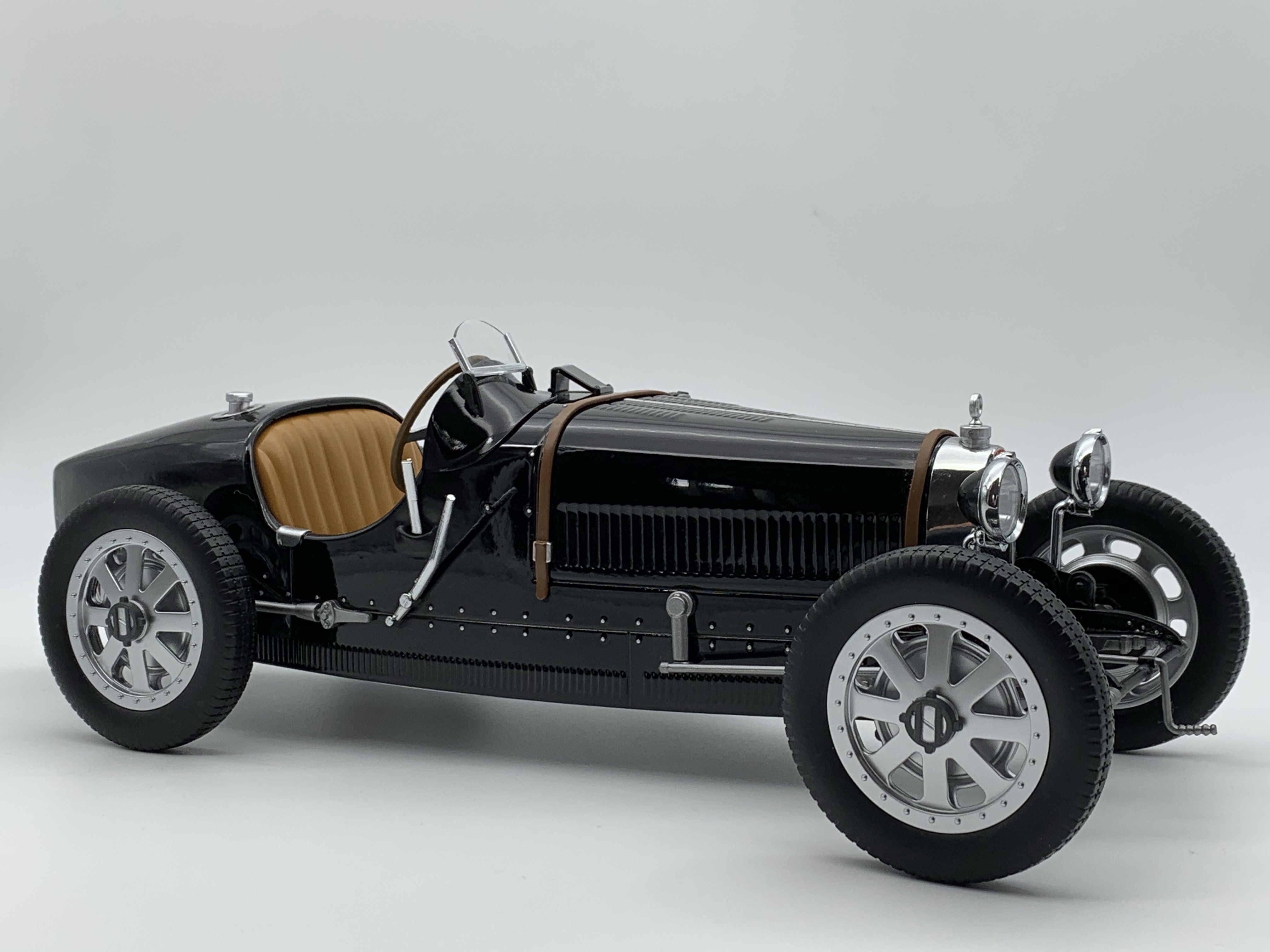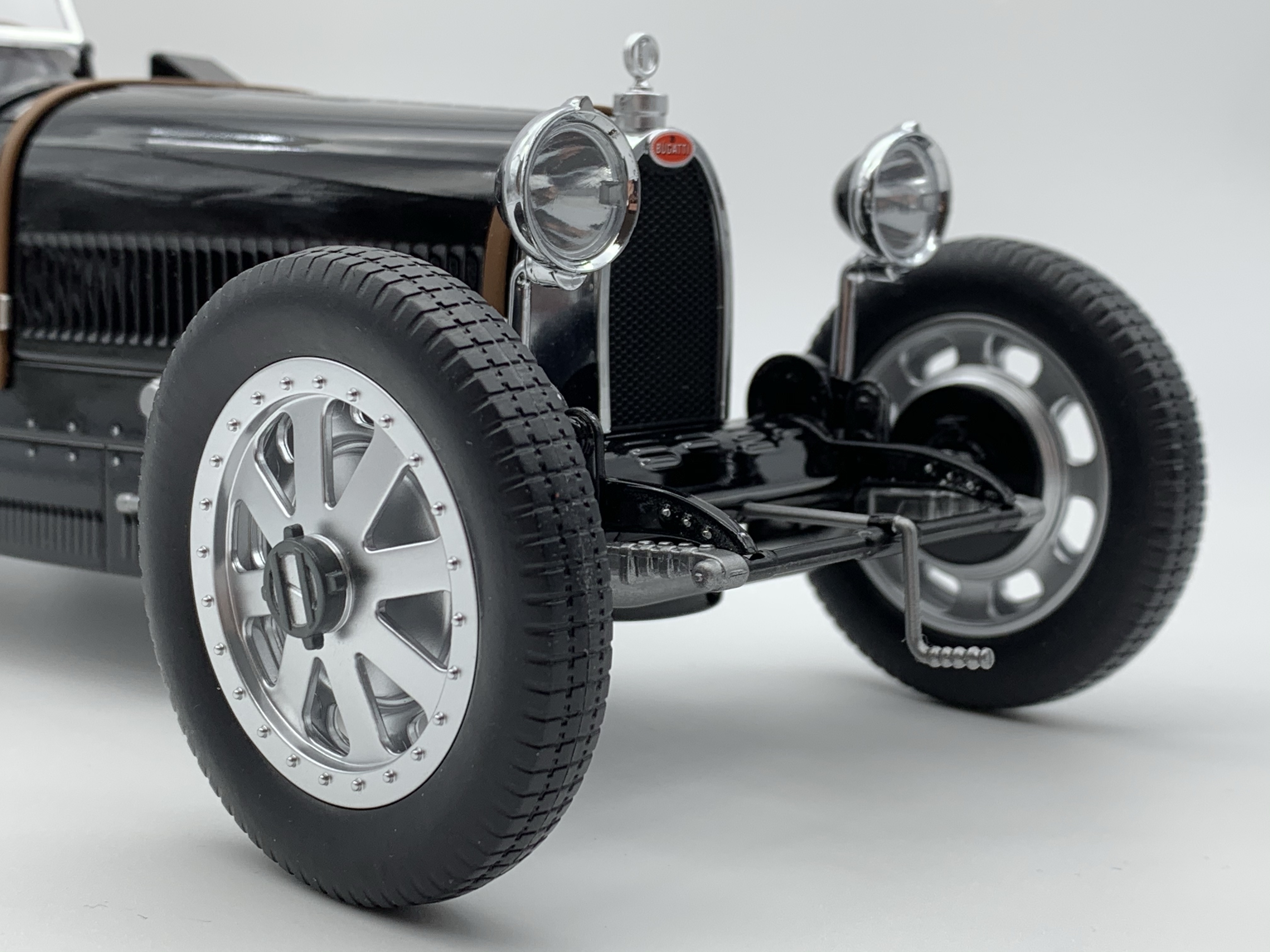 La silhouette est très bien reproduite et, sans aucune hésitation, nous reconnaissons la Type 35. Les proportions sont justes et cette miniature est juste superbe. A l’avant, la calandre en forme de fer à cheval est chromée et encadrée par deux phares chromés également.