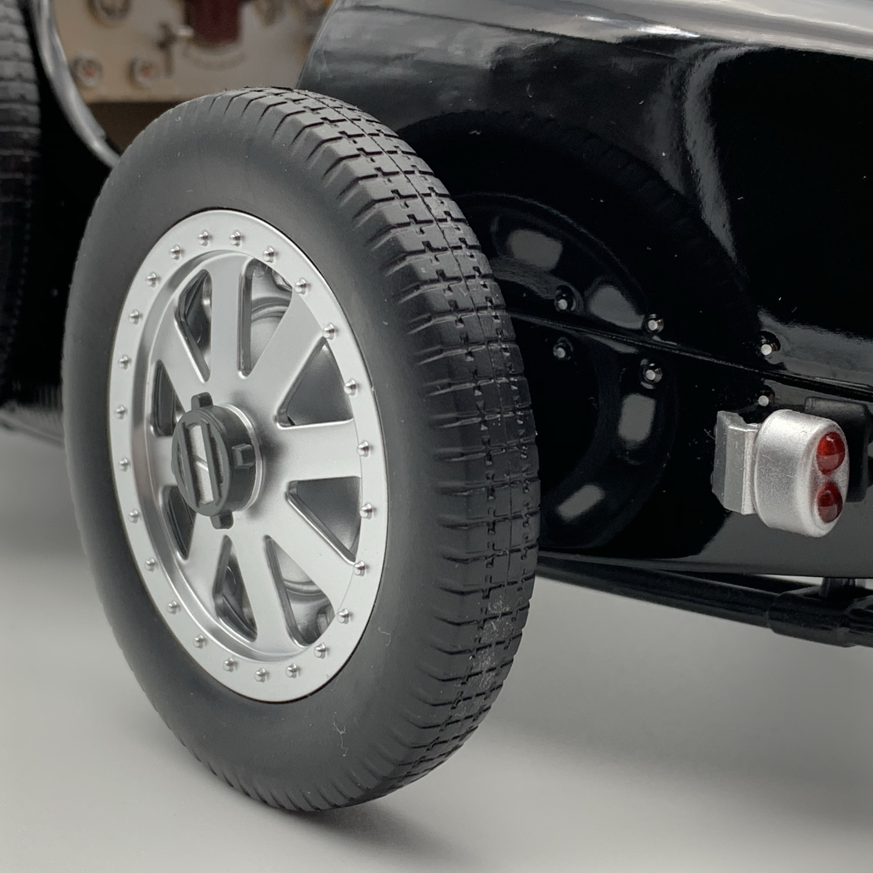 Bugatti a également développé pour la première fois des roues légères spéciales afin de réduire les masses non suspendues et améliorer ainsi le comportement des suspensions. Les roues en fonte d’aluminium avec huit rayons plats, jantes amovibles et tambours de freins intégrés sont une véritable innovation. Une bague de centrage permettait d’éviter que le pneu ne déjante.
