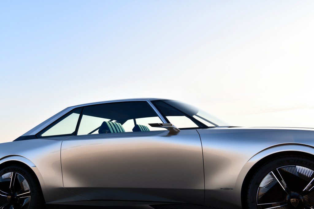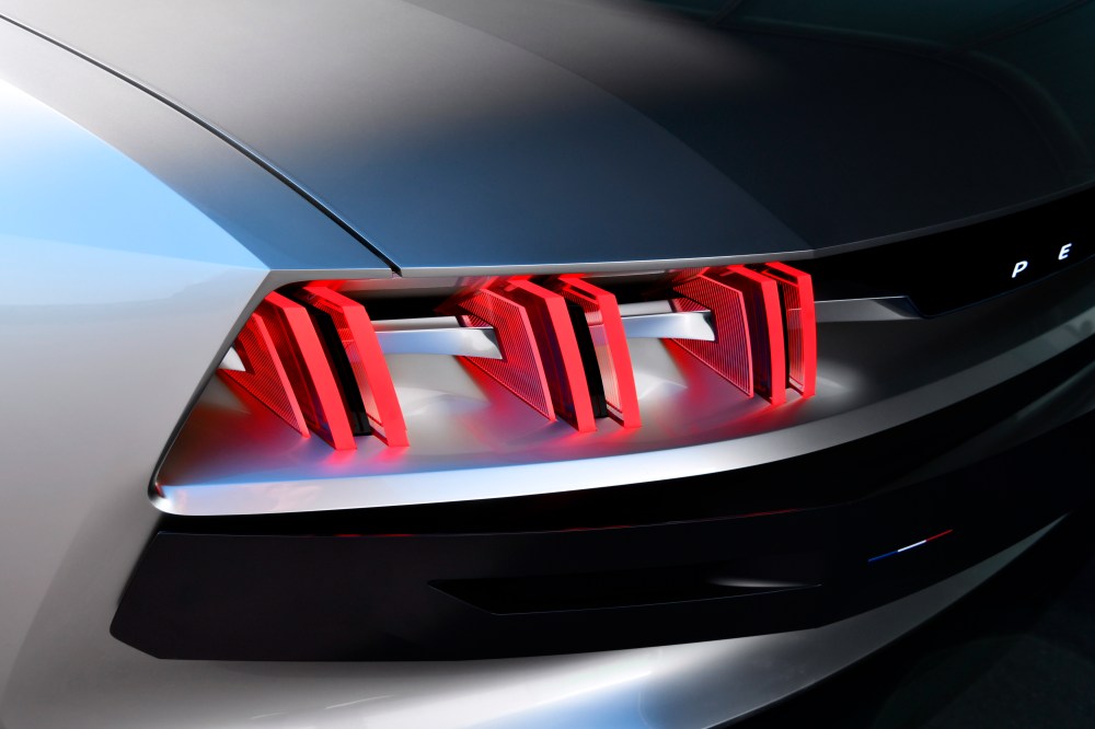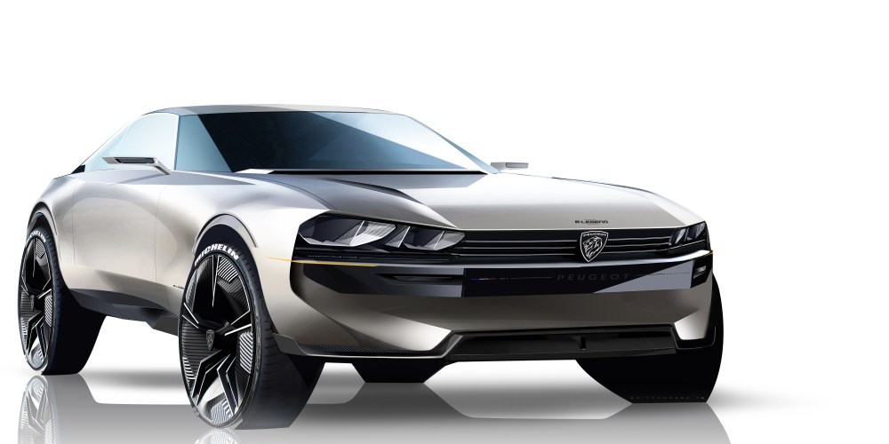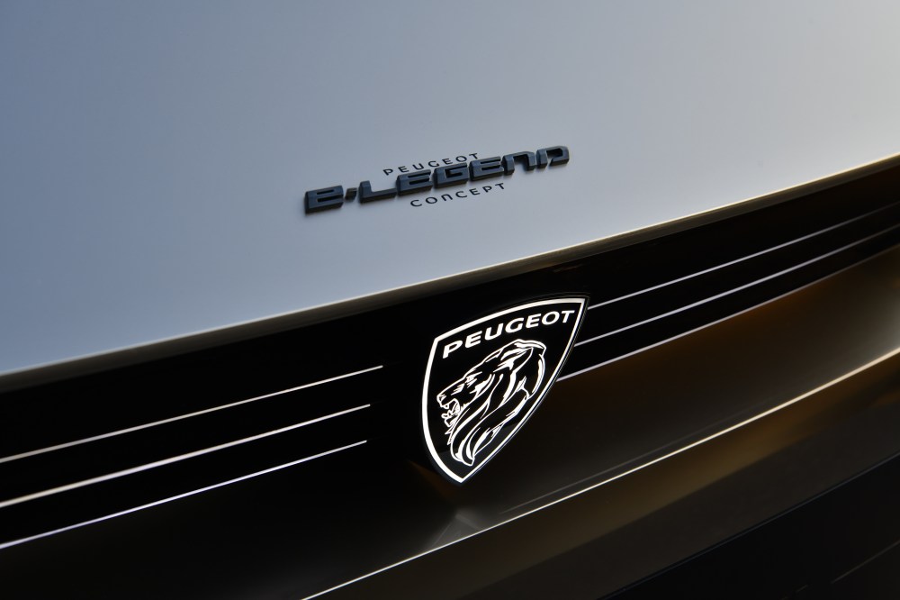 Peugeot ne s’en cache pas, les stylistes ont puisé dans le passé de la marque pour créer ce Concept car. Le coupé 504, une voiture signée Pininfarina et commercialisée en 1969, a servi de modèle et, comme nous le précise le dossier de presse du constructeur, « nous trouvons dans e-LEGEND tous les grands thèmes stylistiques de son aïeule : une silhouette légère, athlétique et acérée ainsi qu’un habitacle arqué vers le train arrière, bénéficiant de larges parties vitrées. […] La carrosserie revêt une teinte grise teintée de couleur champagne, extrêmement tendue. Suivant la lumière extérieure, la couleur passe d’un chrome reflétant tout son environnement à un aspect métal bronze poli. Le procédé utilisé est semblable à celui appliqué au flaconnage des plus grands parfumeurs. […] Les roues sont composées de jantes de 19 pouces de diamètre et de pneumatiques Michelin® de dimensions issues de la grande série ».