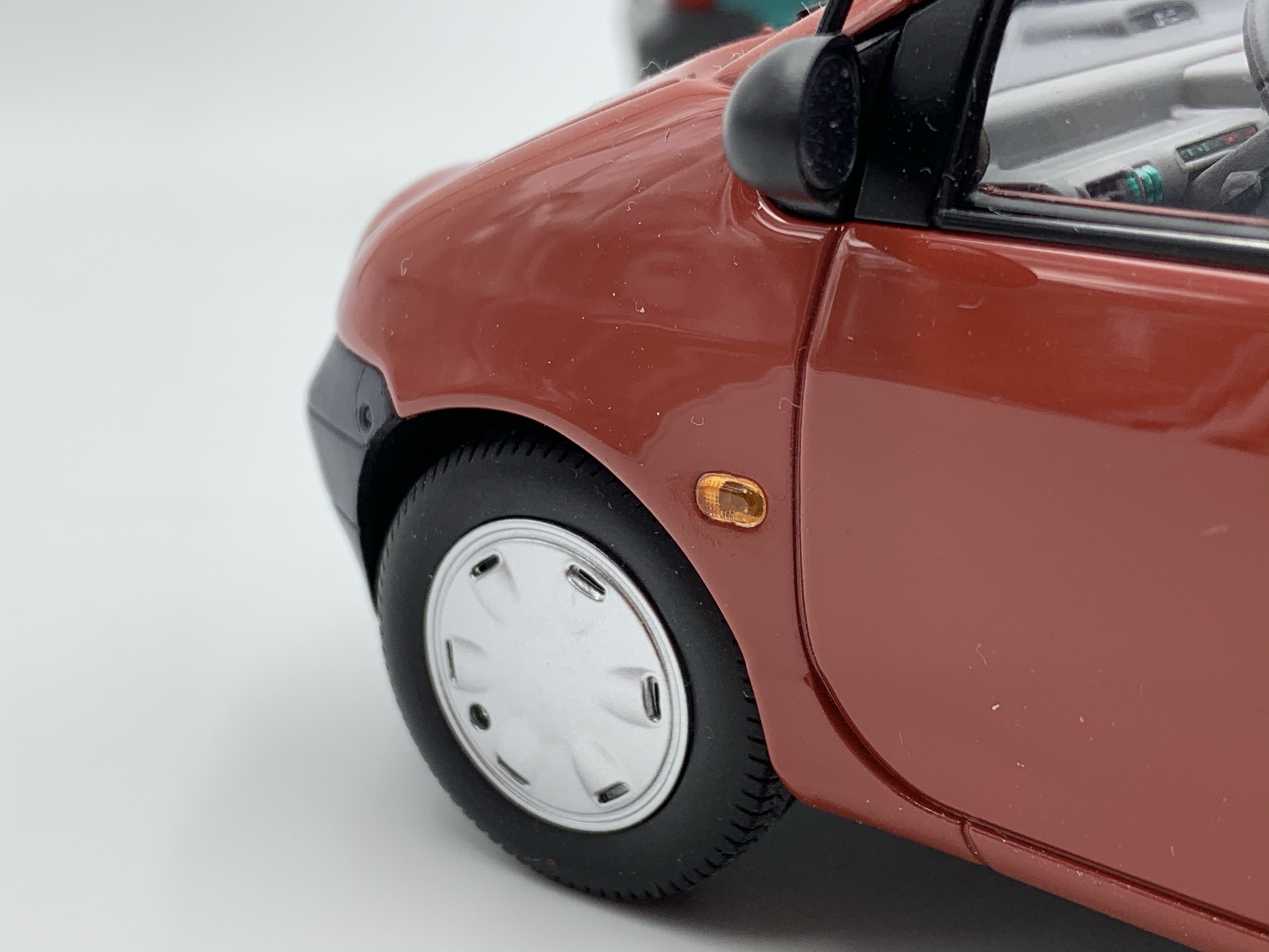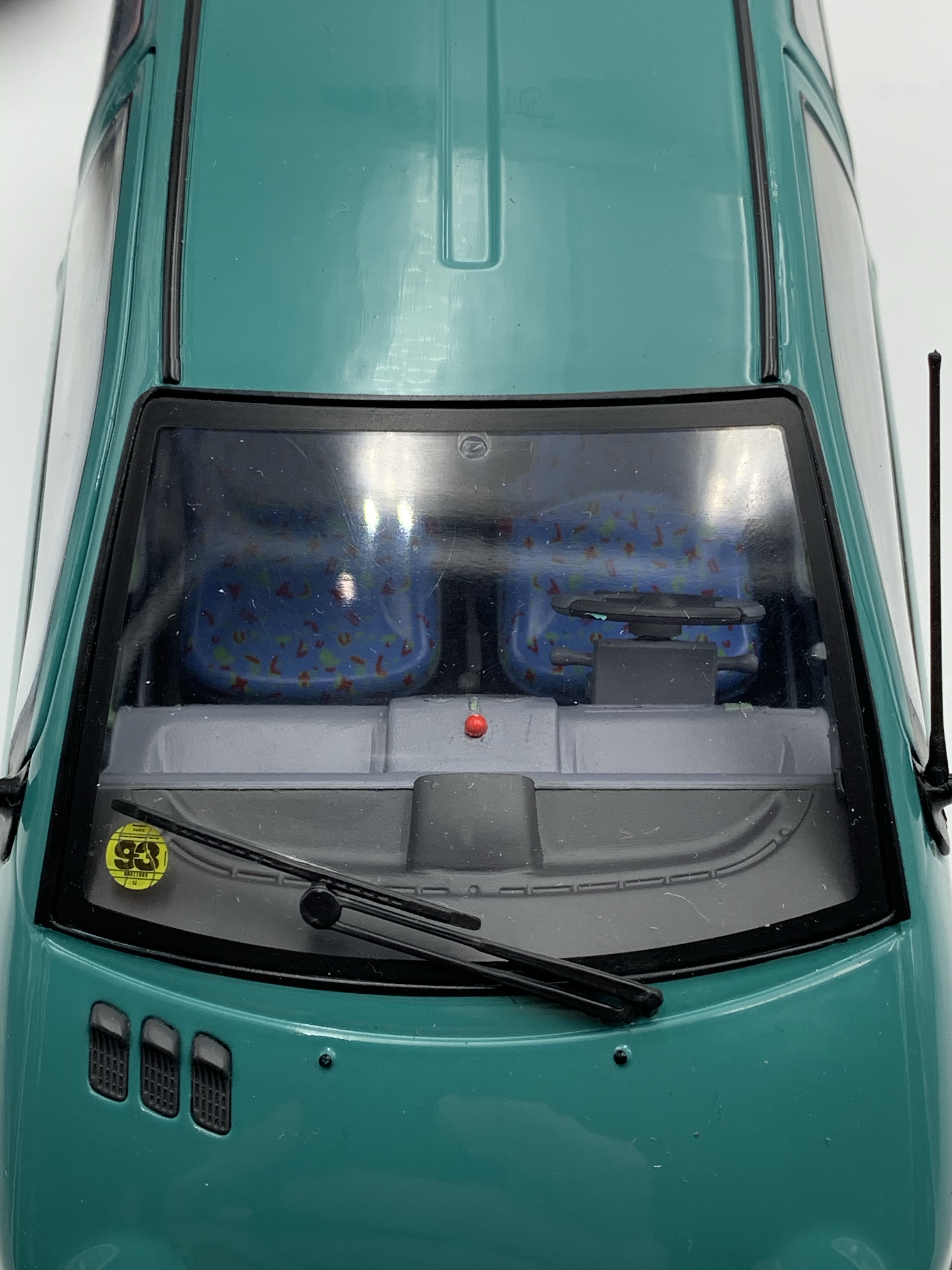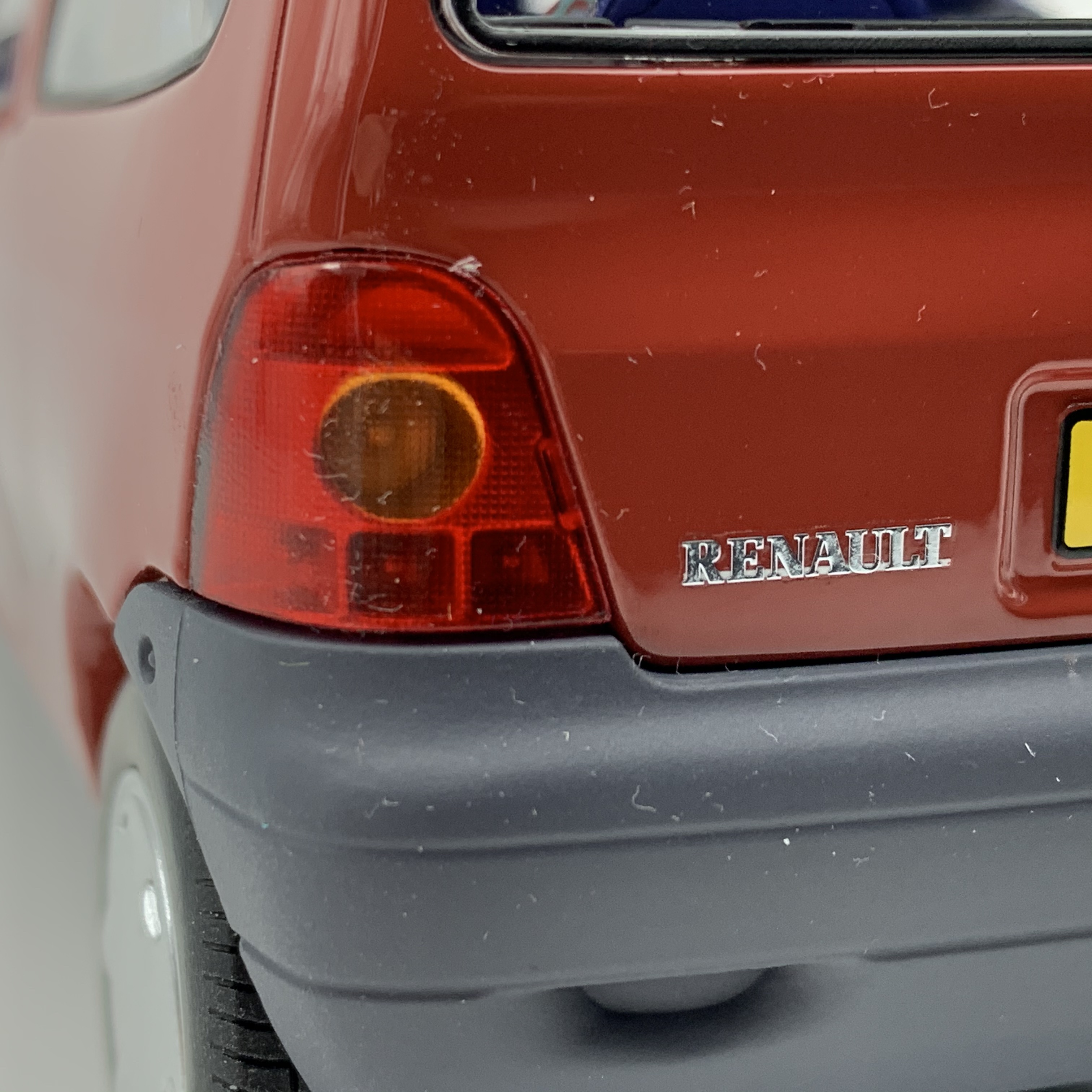 Phares, feux, répétiteurs de clignotants, essuie-glaces, antenne et logos, voici la liste rapide des quelques pièces rapportées qui viennent embellir nos miniatures. En dépit d’un logo Renault sur le hayon relativement grossier, la Twingo de Solido remporte le point. Elle bénéficie en outre de très beaux marquages sur le pare-brise (vignette de l’année 1993 – légèrement trop grosse en taille) et la lunette arrière. Notre Twingo siglée Norev souffre quant à elle de feux arrière uniformément rouges (le clignotant devrait être orange), de répétiteurs latéraux de clignotants surdimensionnés et surtout d’une optique de phare opaque à l’avant droit.