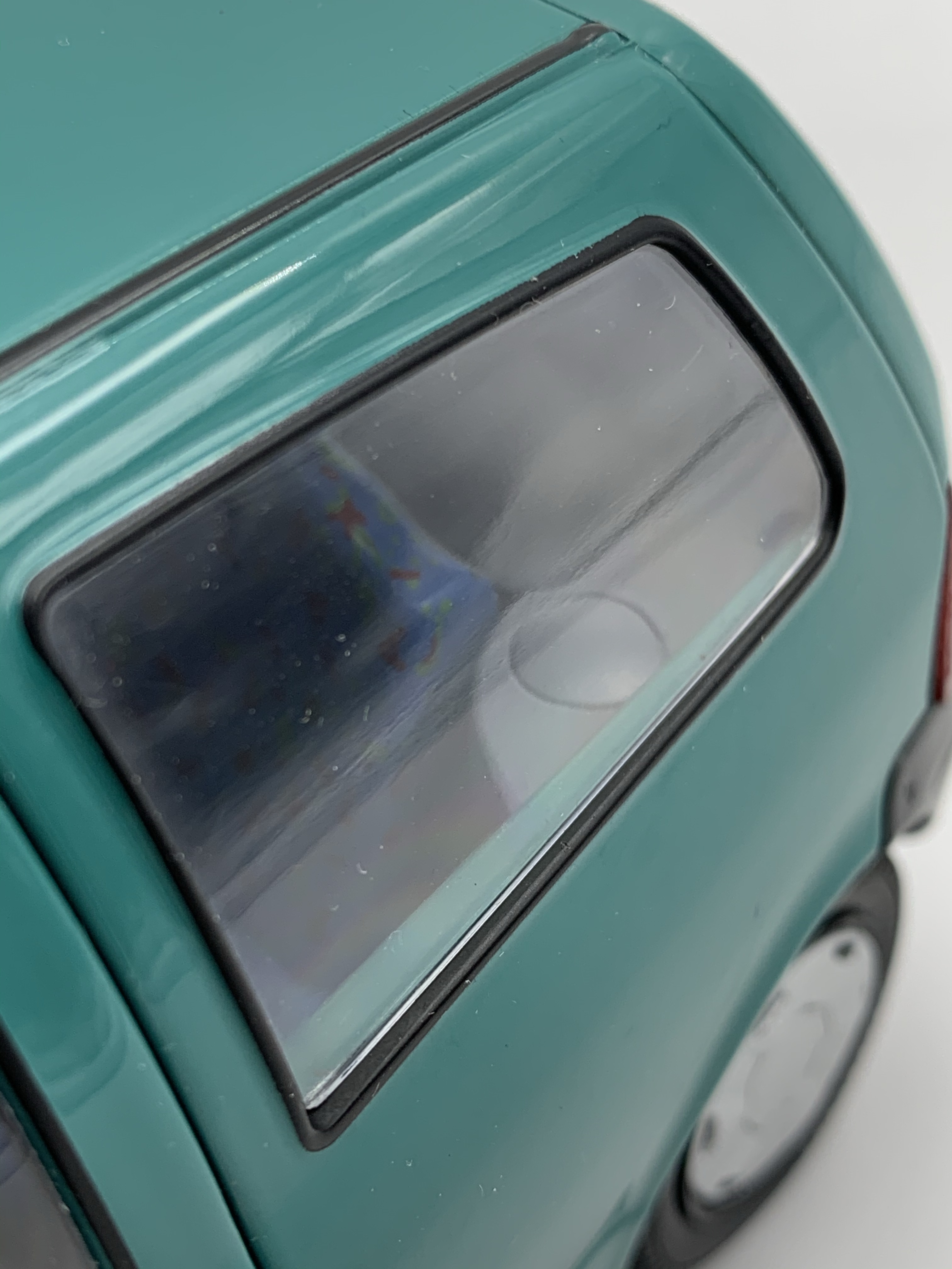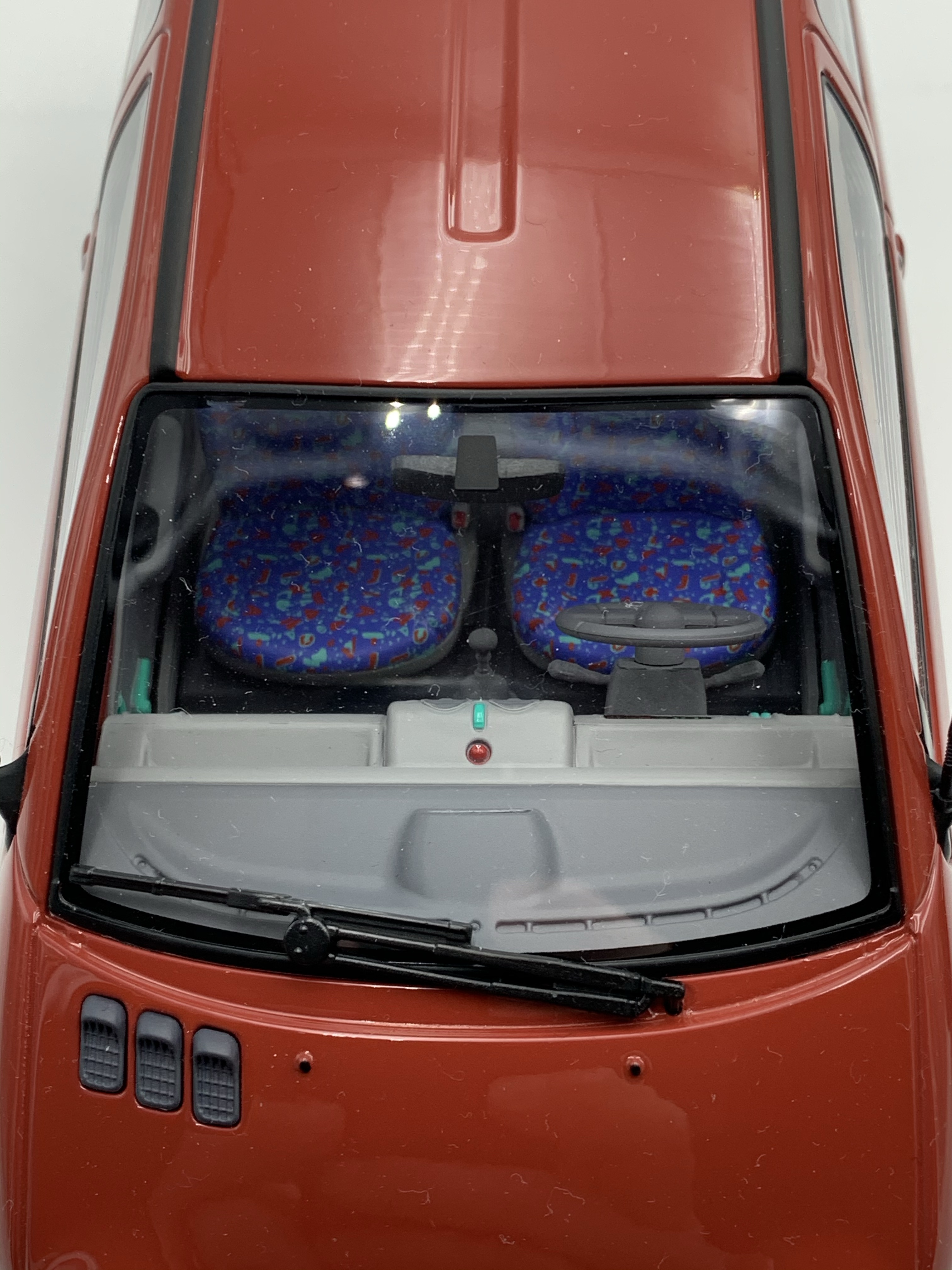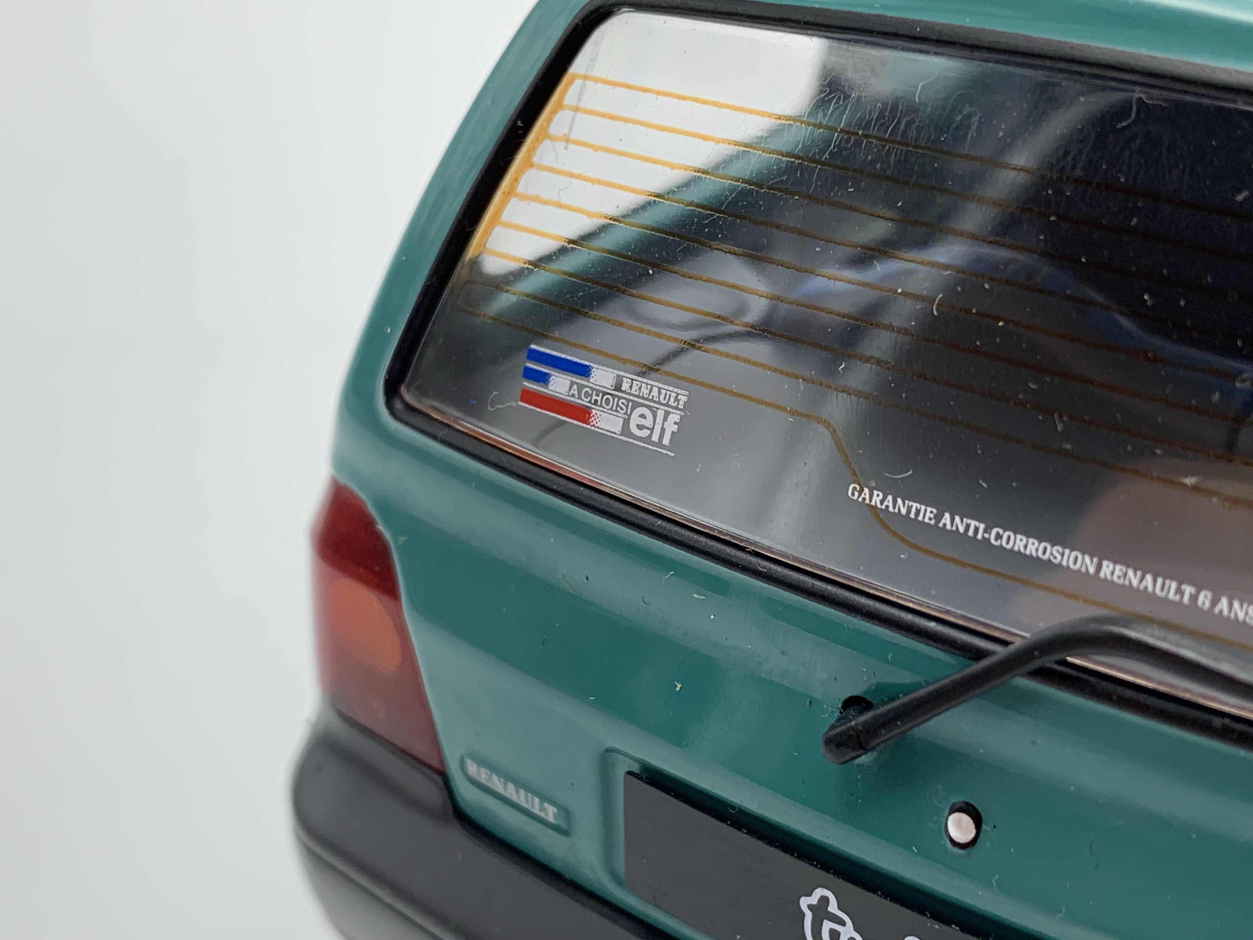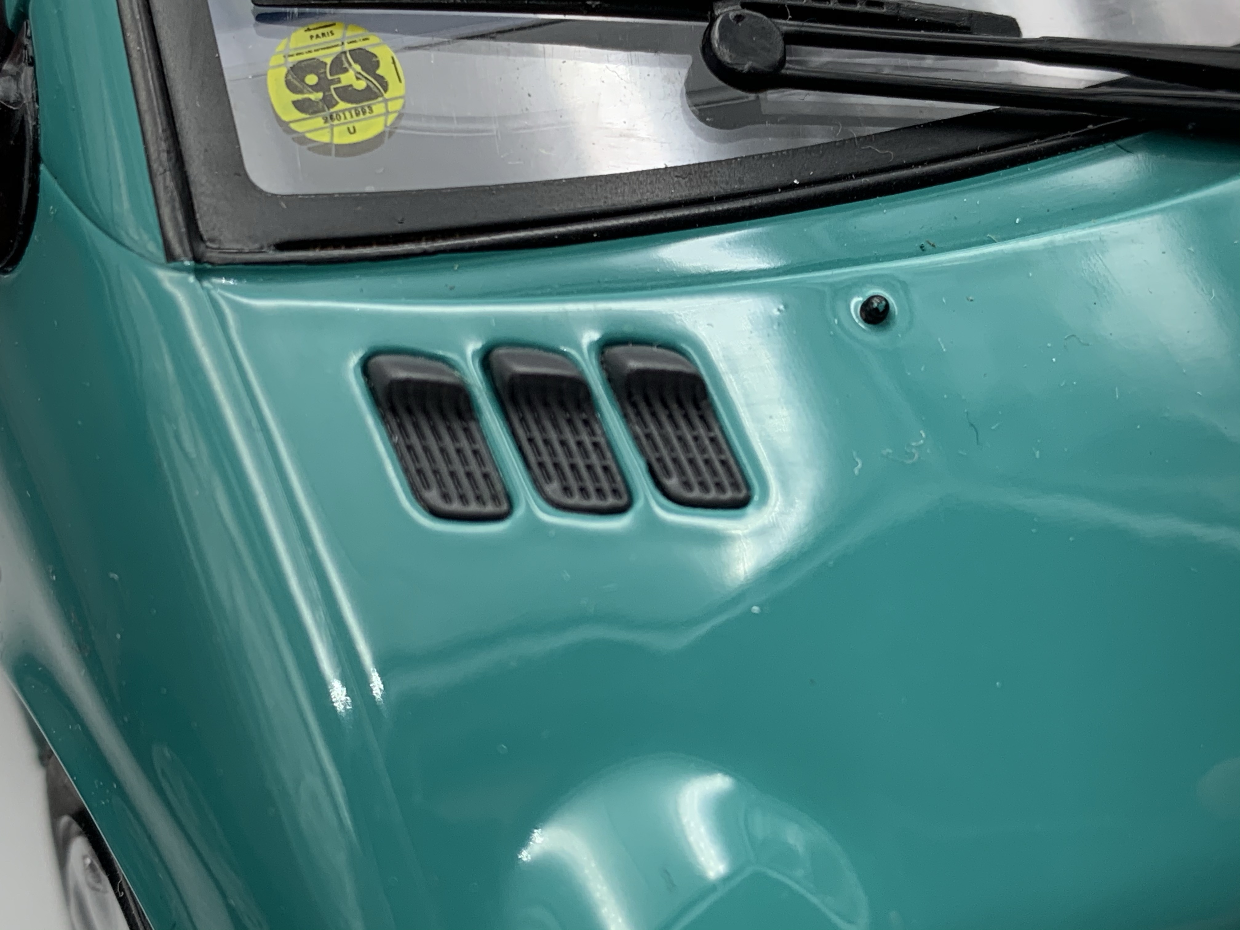 Phares, feux, répétiteurs de clignotants, essuie-glaces, antenne et logos, voici la liste rapide des quelques pièces rapportées qui viennent embellir nos miniatures. En dépit d’un logo Renault sur le hayon relativement grossier, la Twingo de Solido remporte le point. Elle bénéficie en outre de très beaux marquages sur le pare-brise (vignette de l’année 1993 – légèrement trop grosse en taille) et la lunette arrière. Notre Twingo siglée Norev souffre quant à elle de feux arrière uniformément rouges (le clignotant devrait être orange), de répétiteurs latéraux de clignotants surdimensionnés et surtout d’une optique de phare opaque à l’avant droit.
