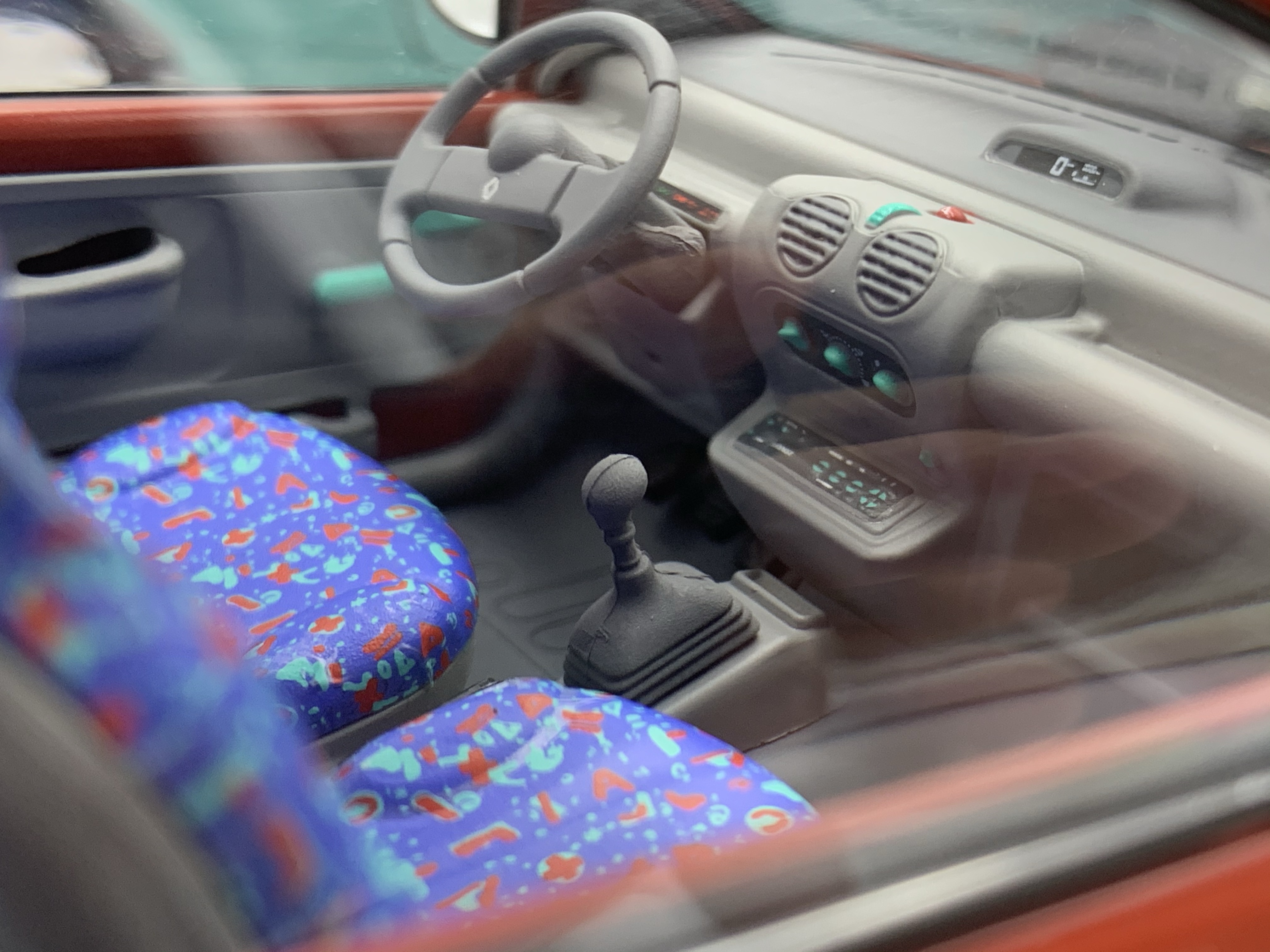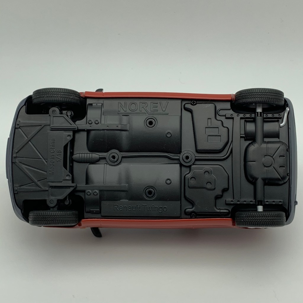 Nos deux fabricants ont fait de beaux efforts pour réaliser des habitacles fidèles au modèle à l’échelle Un. Dans les deux cas nous retrouvons le tableau de bord typique de la Twingo surmonté de son nez de clown actionnant les warnings ainsi que les nombreuses touches de couleur disséminées sur la planche de bord et la sellerie. Cette dernière semble néanmoins plus réaliste sur la version Norev. Il en est de même pour l’écran de l’affichage central de la Twingo plus conforme à la réalité chez Norev. De son côté, Solido n’a pas oublié la manette permettant de faire coulisser la banquette arrière contrairement à Norev. Enfin, sur la Twingo de Solido, l’habillage plastique courant le long de la fenêtre arrière est conforme à celui du modèle à l’échelle Un contrairement à l’épaisse pièce couleur carrosserie disposée dans l’habitacle de la version reproduite par Norev. Statu quo !
