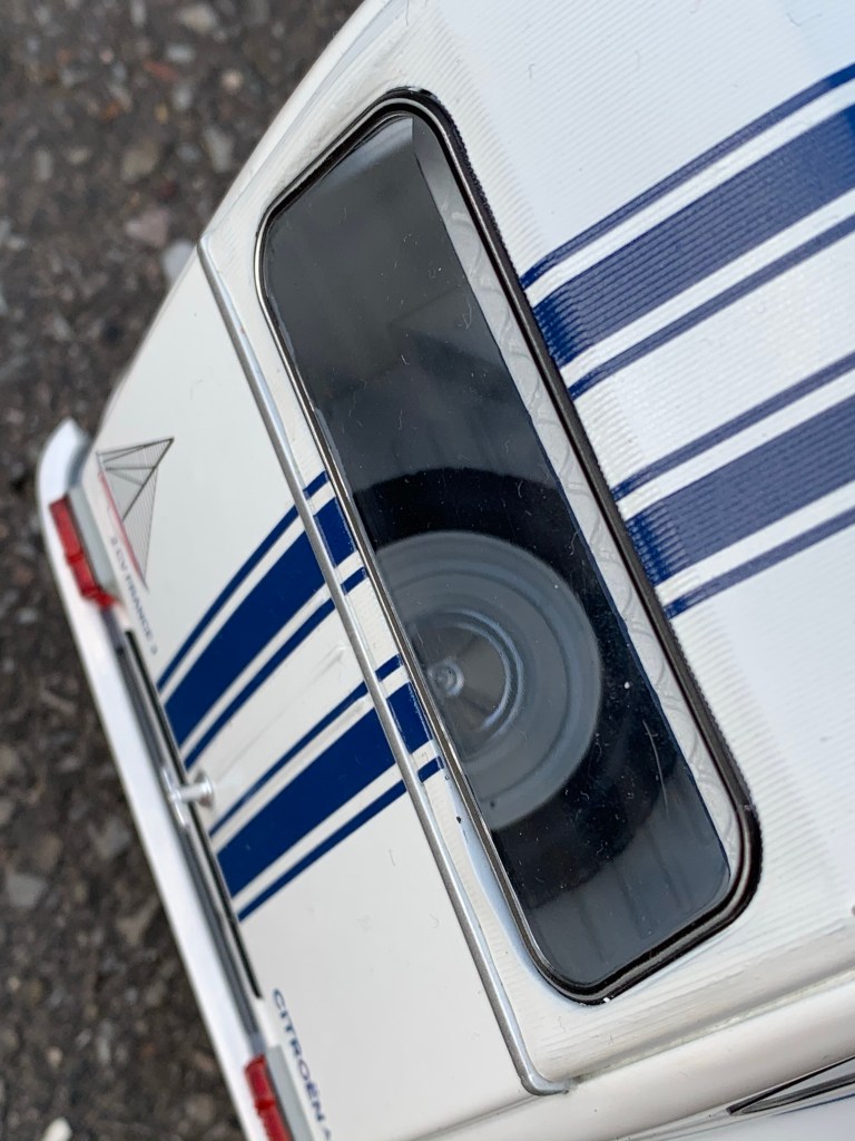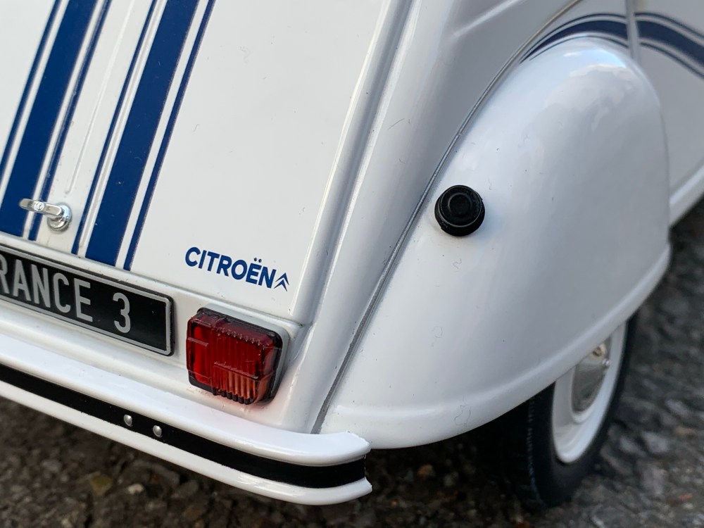Bravo Z-Models !!! Cette 2CV est superbe. La ligne est fidèle et rend parfaitement hommage aux formes rondes de la Deuche. La voiture est présentée capote fermée et vitres avant ouvertes. Il n’est pas possible de refermer ces dernières ou d’ouvrir le toit. Un véritable sans faute.