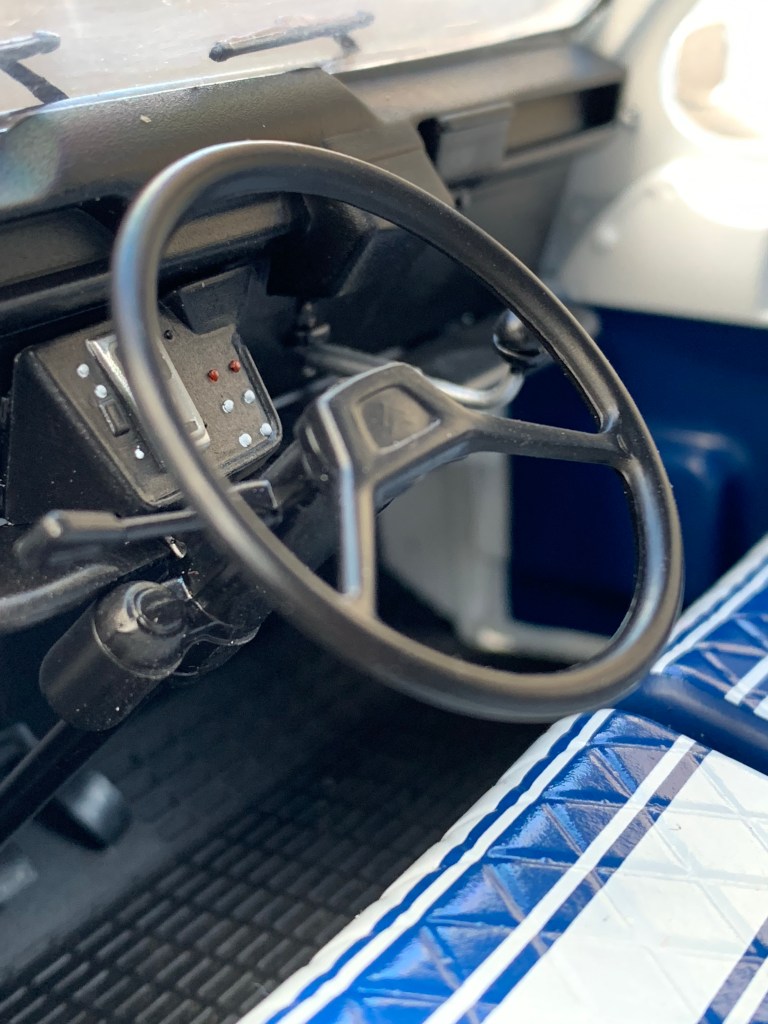 La sellerie est quant à elle très bien réalisée avec ses bandes blanches et bleues caractéristiques de la 2CV France 3. Vous noterez cependant que Z-Models a repris intégralement le moule des sièges et de la banquette de la Charleston qui laisse apparaitre le relief du tissu molletonné typique de cette version mais différent de celui utilisé sur la France 3.