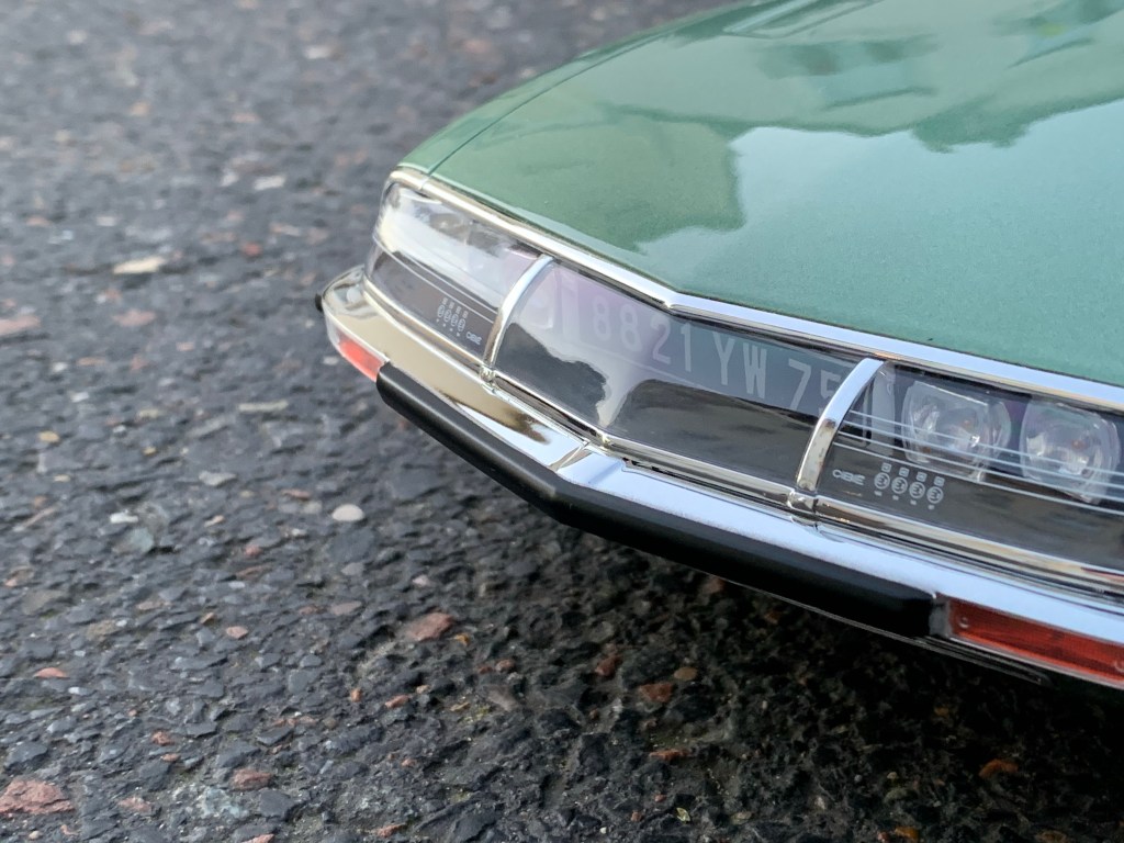 Notre SM se présente dans une très belle couleur or métal, semblable à celle du modèle ayant illustré le premier catalogue de la Citroën. La couleur est bien apposée et le rendu est superbe. Le montage et la finition ne souffrent pas la critique, ils correspondent aux habituels standards de qualité de Schuco. Les vitrages sont bien réalisés et tout particulièrement ceux recouvrant toute la partie arrière. Le déflecteur des vitres avant aurait cependant mérité d’être un peu plus incliné pour se rapprocher de la réalité et j’aurais préféré que les encadrements de vitres soient chromés plutôt que simplement peints en gris.
