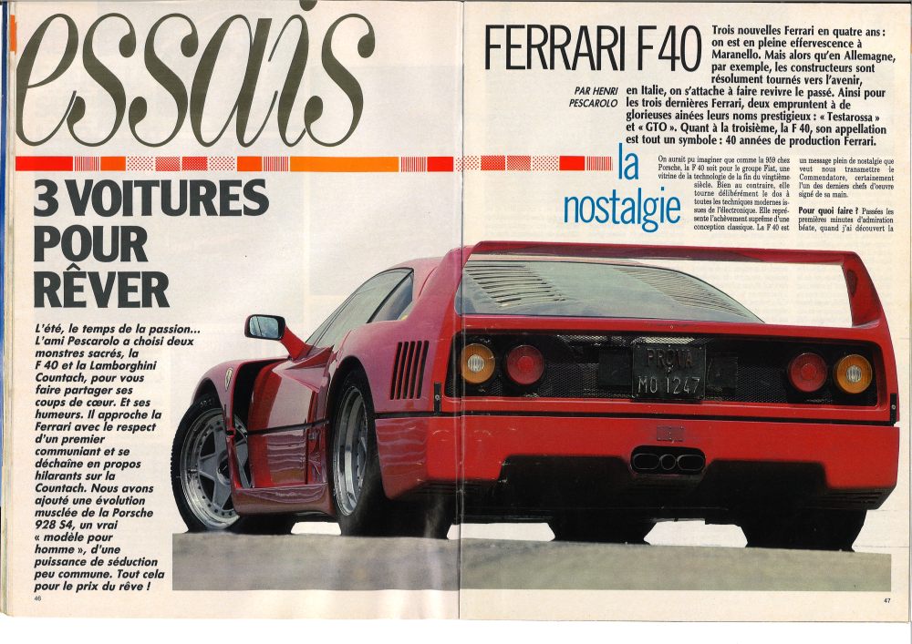 Il est vrai que cette dernière attire tous les regards. Dans le numéro 324 de l’Action Automobile publié en juillet 1988, le grand pilote Henri Pescarolo a eu « le souffle coupé » par la beauté de la F40 : « J’avais déjà vu de nombreuses photos de la F40, mais quand je l’ai rencontrée à Fiorano j’ai été subjugué. Elle rompt définitivement avec les lignes de la GTO, elle-même fille des BB. Elle oublie complètement qu’une de ses sœurs est la Testarossa (lire également l’article dédié à ce modèle emblématique). Elle ne ressemble à rien sauf à une voiture de course. J’aurais aimé la découvrir dans la rue, le choc doit être formidable. Sur un circuit elle est tellement à sa place qu’elle parait naturelle. […] Il se dégage de cette voiture une incroyable impression de puissance sans que l’élégance et la finesse propres à la marque aient été sacrifiées ».