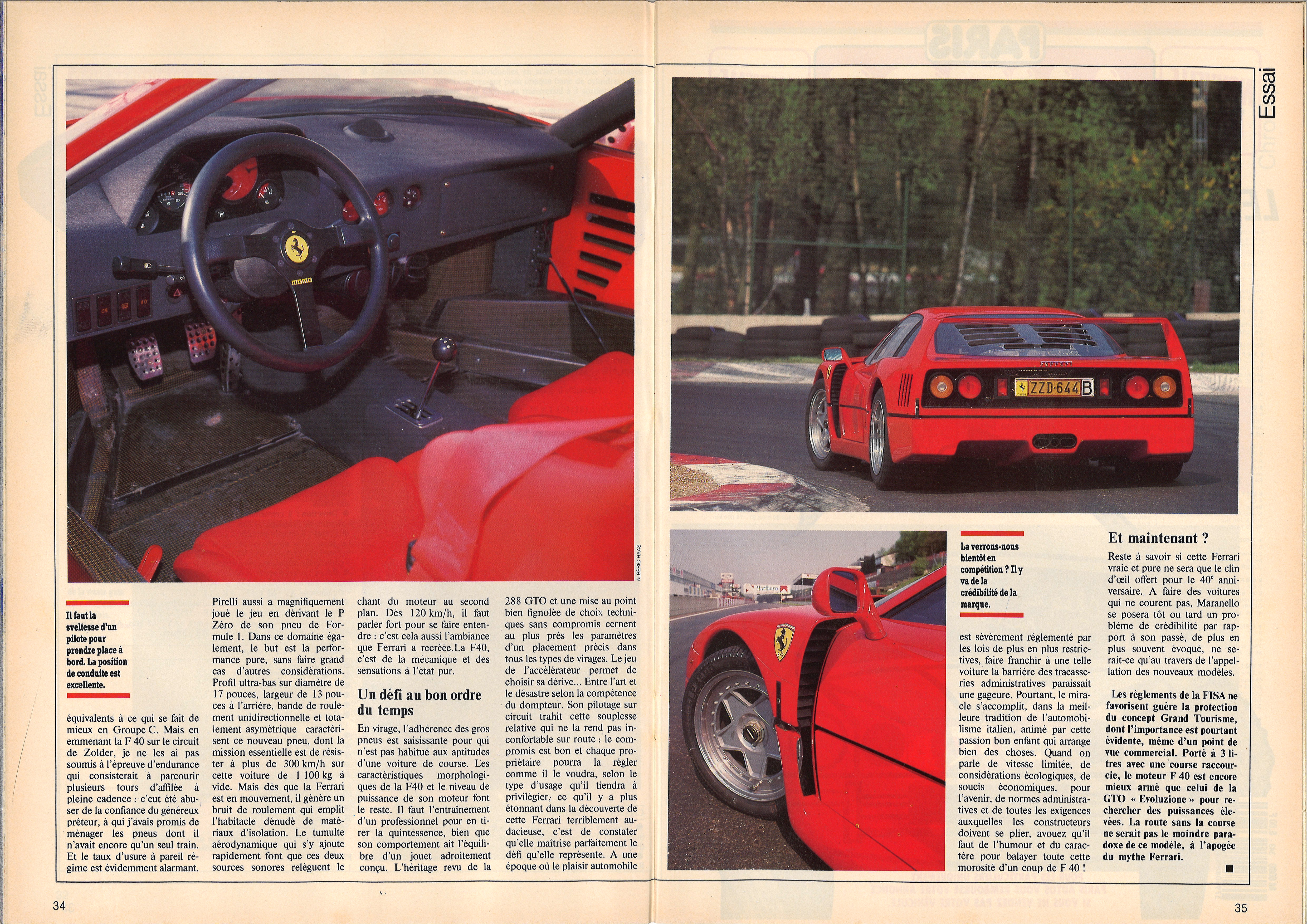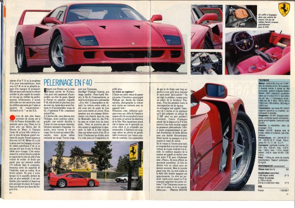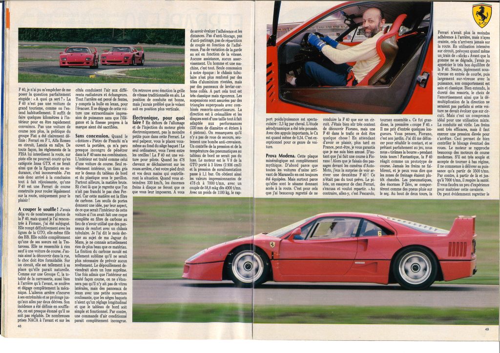 Pierre Dieudonné complète : « la F40 est la plus puissante et la plus rapide des Ferrari jamais mises sur la route. Donnée pour 324 km/h elle bat sur le papier tout ce qui a jamais existé ».