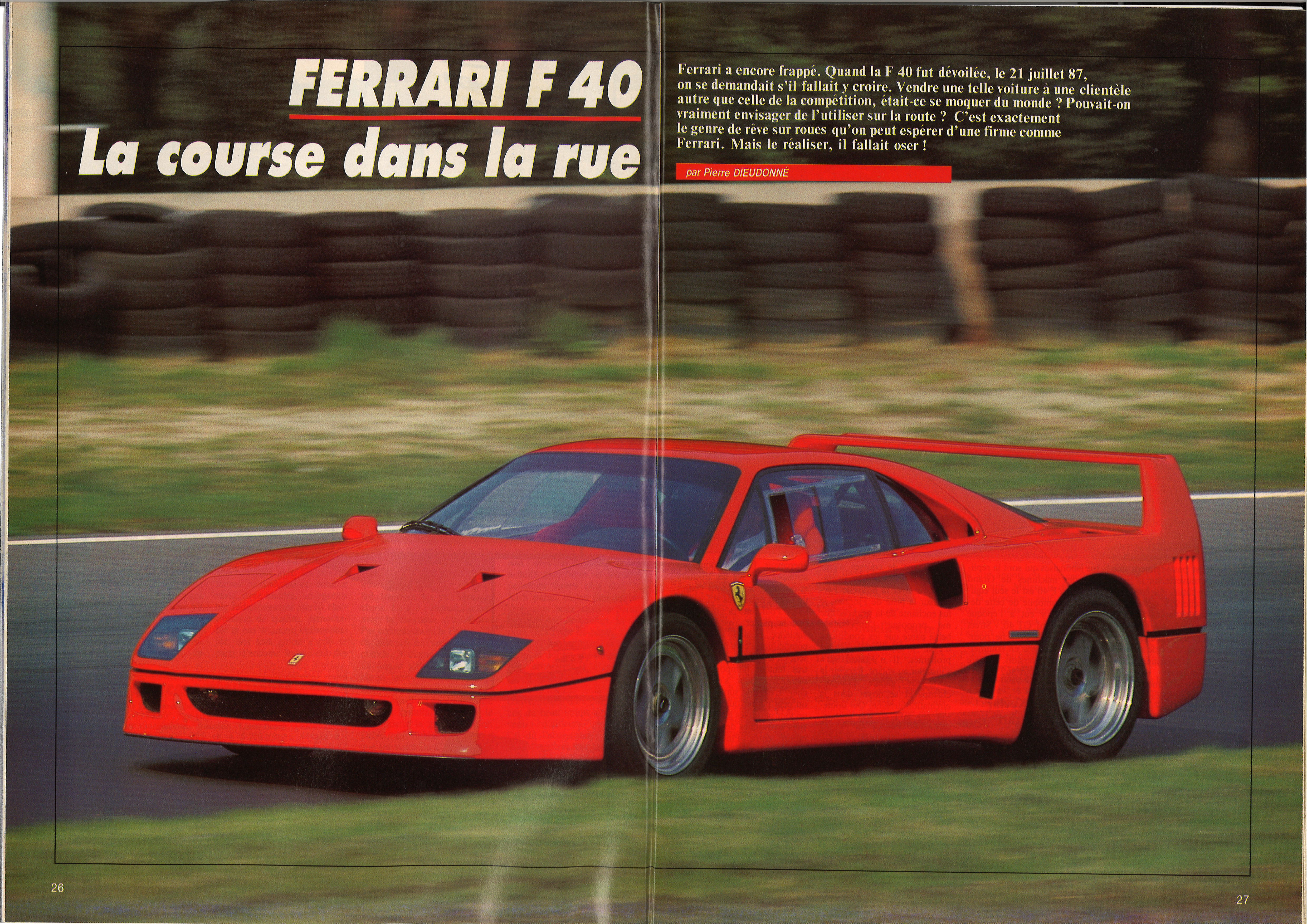 Le pilote belge Pierre Dieudonné a eu, lui, la chance de pouvoir essayer la F40 sur route ouverte et de l’admirer dans la rue. Voici ce qu’il en dit dans le numéro 625 du magazine Auto Hebdo publié en mai 1988 : « Il n’est pas nécessaire de s’étendre sur l’agressivité visuelle de la F40. Dès qu’elle pointe le museau, c’est l’ébahissement généralisé. Une auto de course est dans la ville et personne ne manque de s’en apercevoir. Elle provoque des attroupements sur les trottoirs et des réactions en tout genre de la part des autres automobilistes. Pour cette même raison aussi il faut la piloter avec la même vigilance qu’une voiture de compétition : certains se saisissent en la voyant arriver ; d’autres tentent n’importe quelle manœuvre pour s’en approcher. L’effet de surprise passé, on peut penser qu’elle figurera un jour parmi les grandes réussites stylistiques de la collaboration entre Pininfarina et Maranello : elle donne un coup de vieux à l’élégance gracile de la 288 GTO et sa pureté très aérienne dévoile un futur qui fait regarder la Testarossa d’un autre œil ».