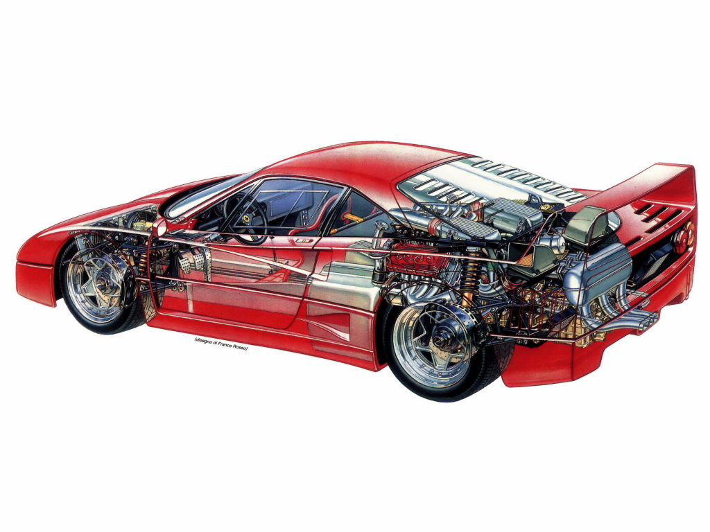 Ses prestations techniques sont tout aussi incroyables. Jean-Pierre Jabouille, pilote de Formule Un, nous détaille les caractéristiques de la F40 dans le numéro 504 de l’Automobile Magazine publié en juin 1988 : « Rubis parmi les rubis, joyau dans son écrin : le moteur. Le V8 32 soupapes, quatre arbres de la GTO et de l’Evoluzione. […] En soulevant le capot rappelant celui des 512 qui s’illustrèrent au Mans, le plus blasé ne peut laisser s’échapper un sifflement admiratif. La fonderie des trompettes d’admission est une œuvre d’art. Le positionnement des échangeurs aux superbes soudures, la présence des raccords du type Aéroquip, les couvres-culasses trahissent l’expérience de la course. Seule concession au confort et à l’usage routier : les suspensions sont montées sur des silent-blocs et non sur des rotules. Les chiffres annoncés sont sans équivoque : 478 chevaux à 7000 tr/mn, 58,8 mkg à 4000 tr/mn et déjà 55 mkg à 3500 tr/mn. Rarissime, forçant le respect. L’inévitable comparaison avec la Porsche 959 (lire également l’article consacré à la 959) penche en faveur de l’italienne : près de 30 chevaux et pas loin de 9 mkg supplémentaires ».