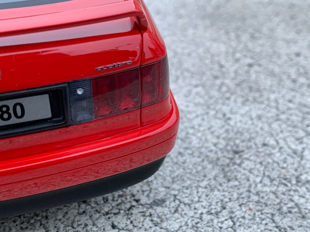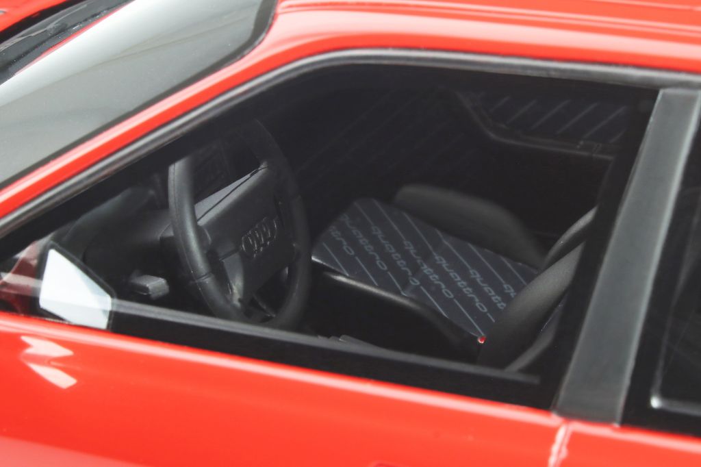Logo quattro sur les ailes et le coffre, aileron spécifique, phares anti brouillard et clignotants avant blancs, spoiler intégré à l’avant, rétroviseurs ton caisse, … Ne cherchez pas, OttOmobile a bien fait son travail et toutes les pièces spécifiques à la quattro compétition sont présentes sur cette miniature. Un seul bémol en ce qui me concerne, les balais d’essuie-glace sont bien trop proéminents et auraient dû affleurer la baie de pare-brise. C’est dommage, cela aurait pu être corrigé facilement.