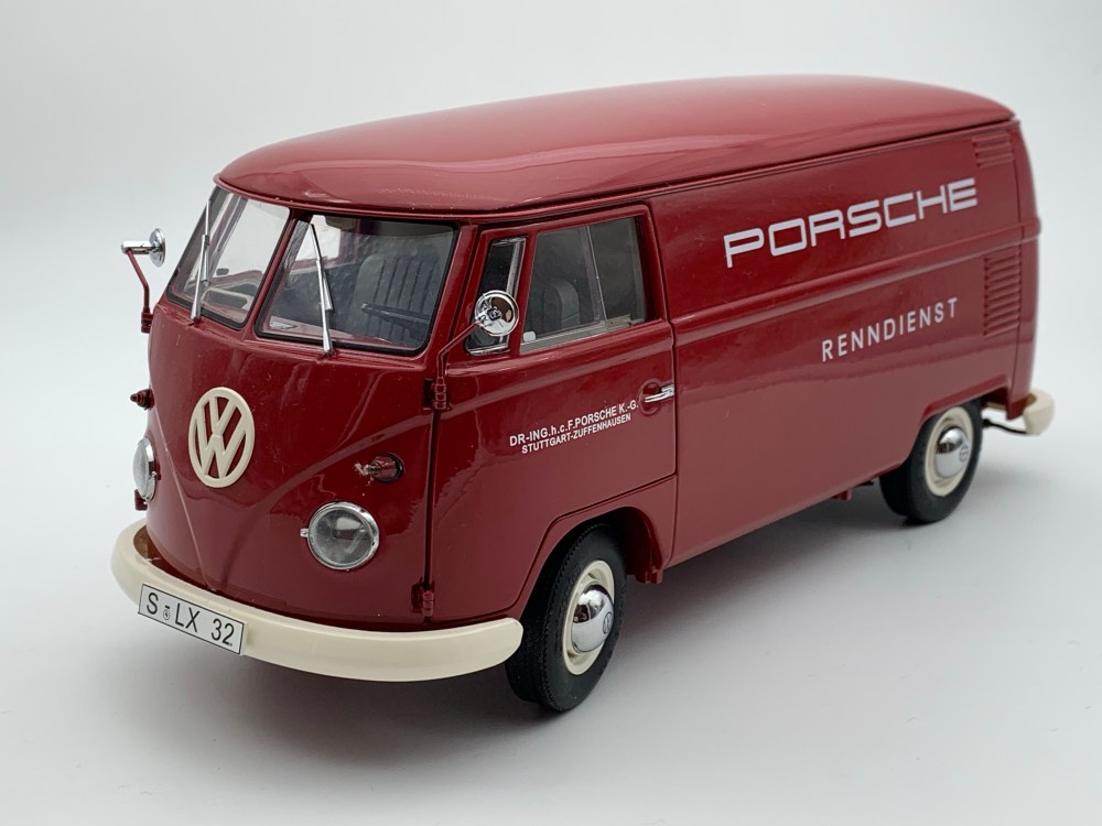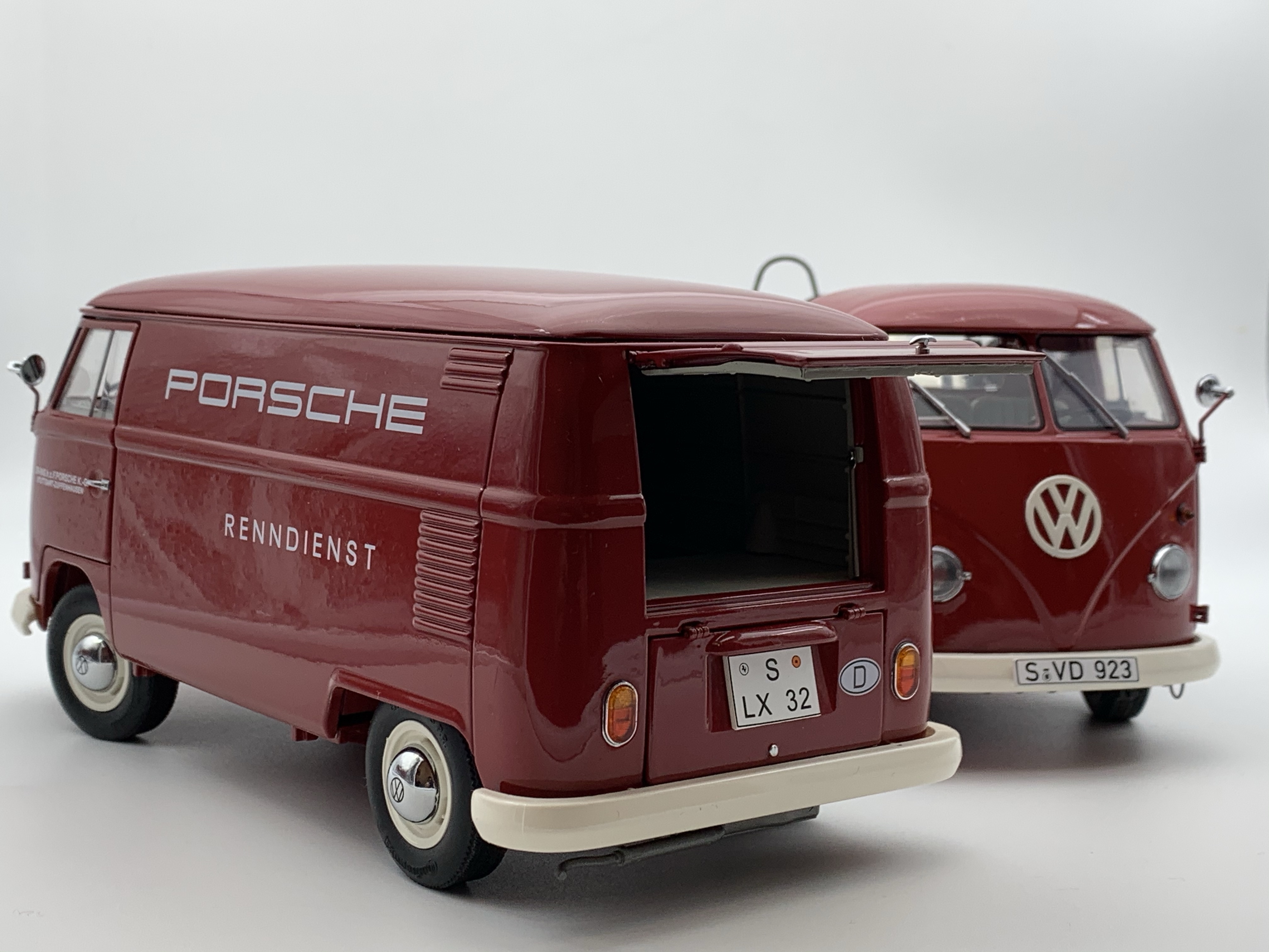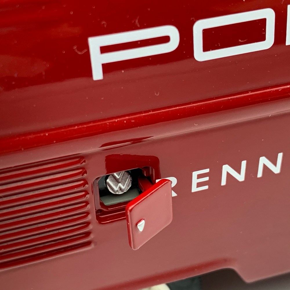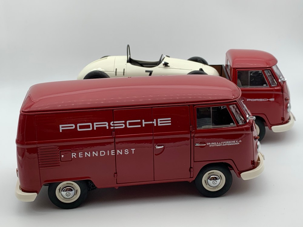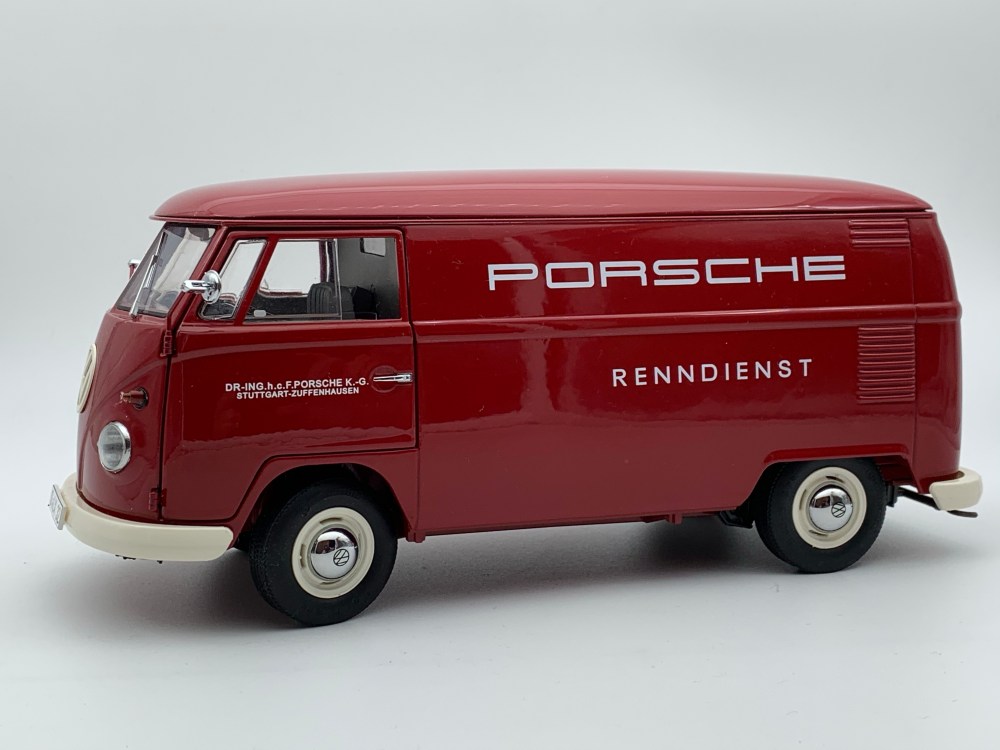 Schuco produit le T1 depuis de nombreuses années et ce dernier a été décliné en de multiples couleurs et versions. Le fabricant allemand a choisi pour cette nouvelle édition de reproduire l’un des véhicules qui composait le parc de l’écurie Porsche en course automobile. Porsche utilisait alors de très nombreux Combi pour accompagner les superbes camions Man, Opel puis Mercedes qui transportaient les voitures de course. Le T1 est entièrement peint en rouge, la couleur officielle de l’écurie Porsche pendant les années 60.