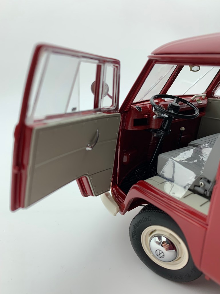Les portières sont articulées à l’aide de deux charnières et s’ouvrent largement sur un habitacle ultra détaillé. Chaque portière bénéficie d’une garniture intérieure conforme à l’original et de vitres coulissantes fonctionnelles.