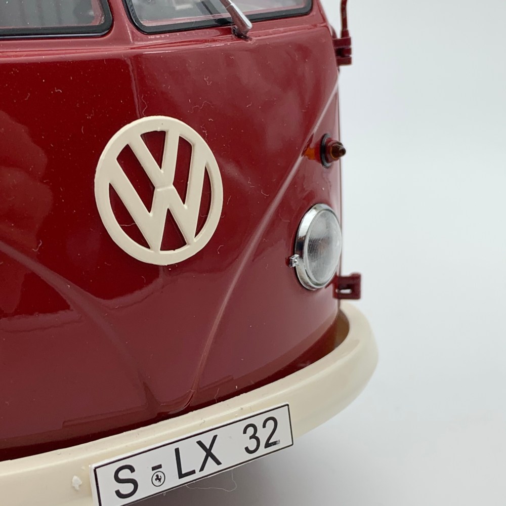 Nous sommes ici en présence d’une version tôlée du célèbre Combi Volkswagen. Il s’agit d’un véhicule commercialisé avant 1963 reconnaissable à sa lunette arrière de petite taille et à ses 9 ouïes d’aération au lieu de dix. Nous retrouvons ici la jolie silhouette du Combi Volkswagen et Schuco a réalisé un très beau travail.