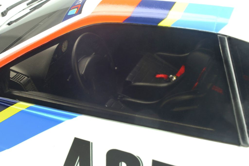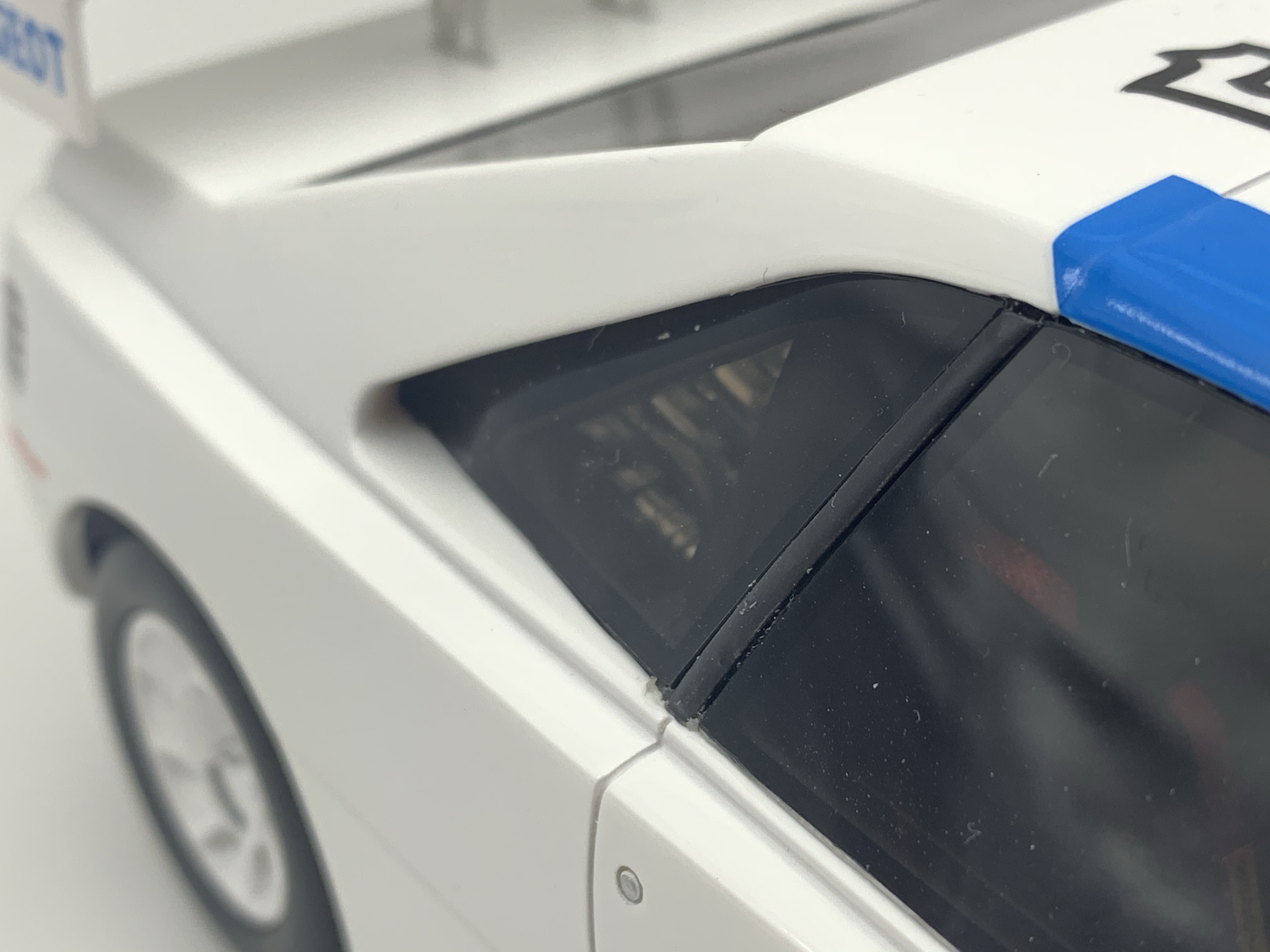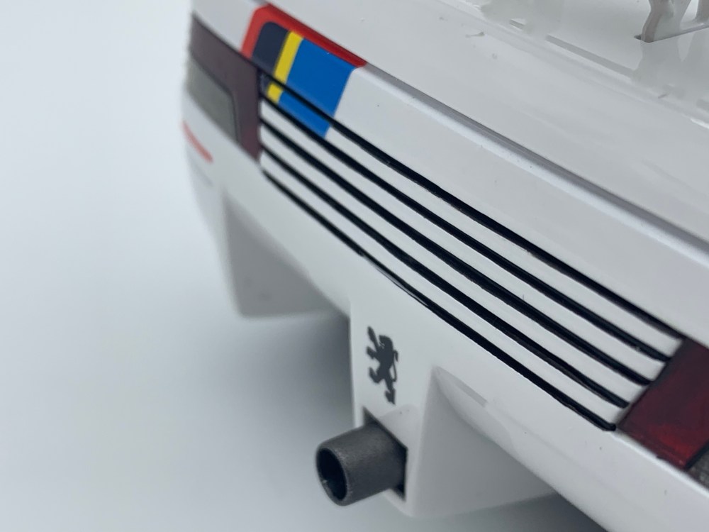 Un fin liseré rouge apparaît sur les pare-chocs. Ces décorations typiques de la 405 Groupe S présentée en 1987 sont bien réalisées et la peinture ne présente aucun défaut. Collées sur la carrosserie, les vitres très fines sont bien montées. Elles sont fortement fumées comme sur la voiture à l’échelle Un. La vitre arrière nous permet néanmoins d’admirer les tubulures d’admission du moteur installé en position centrale.