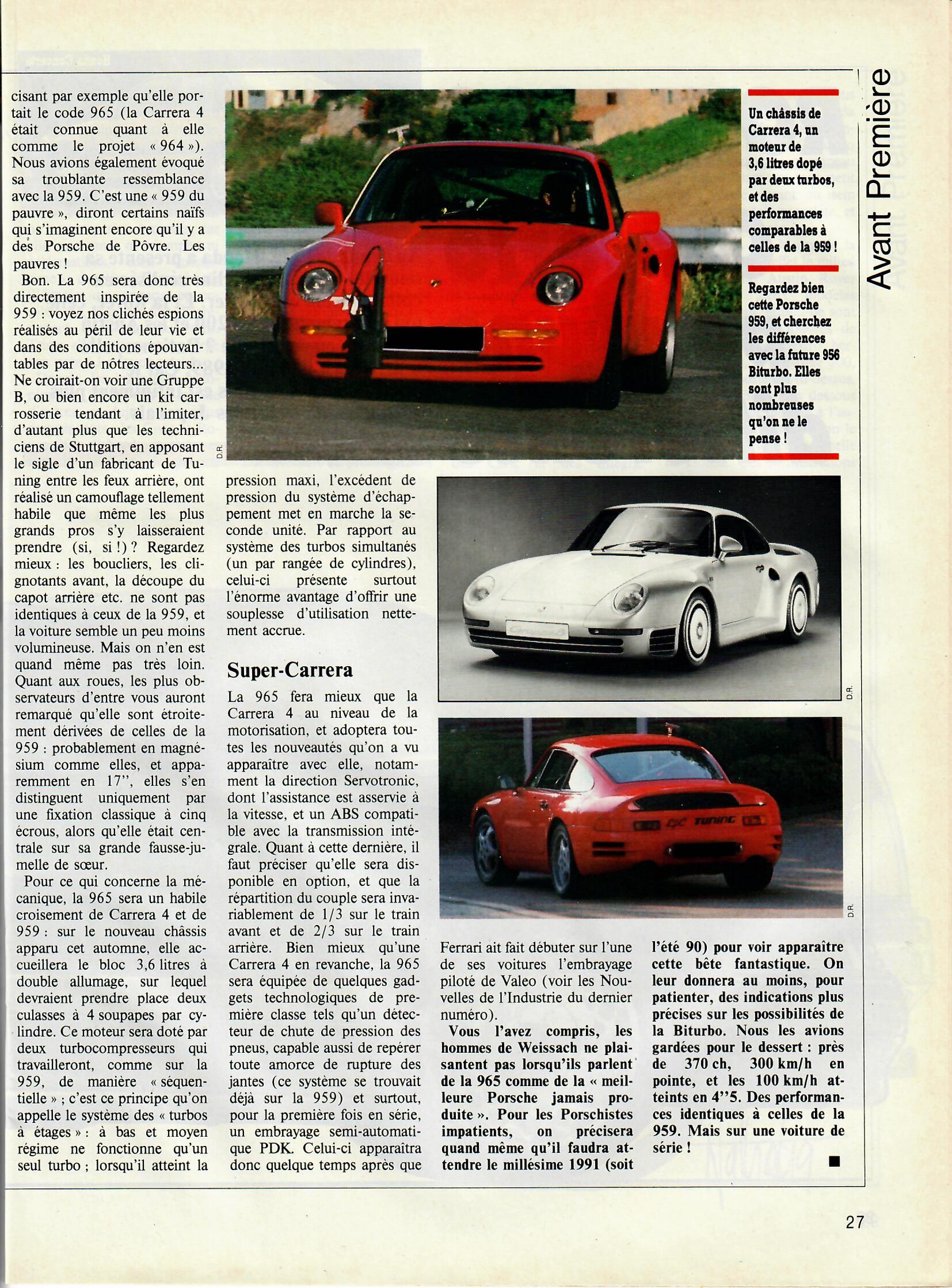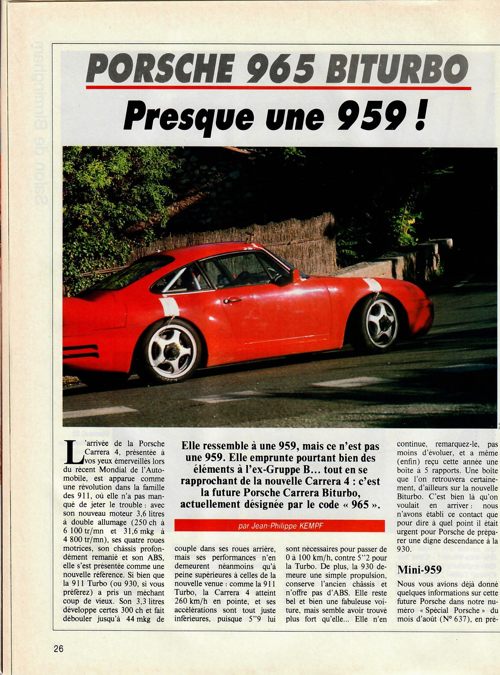 Le magazine Auto Hebdo a surpris l’un des prototypes du projet 965 et le présente dans son numéro 648 publié le 20 octobre 1988. Sous la plume de Jean-Philippe Kempf, le lecteur découvre les secrets de cette future « Porsche Carrera Biturbo » ainsi que trois photos du prototype en action.