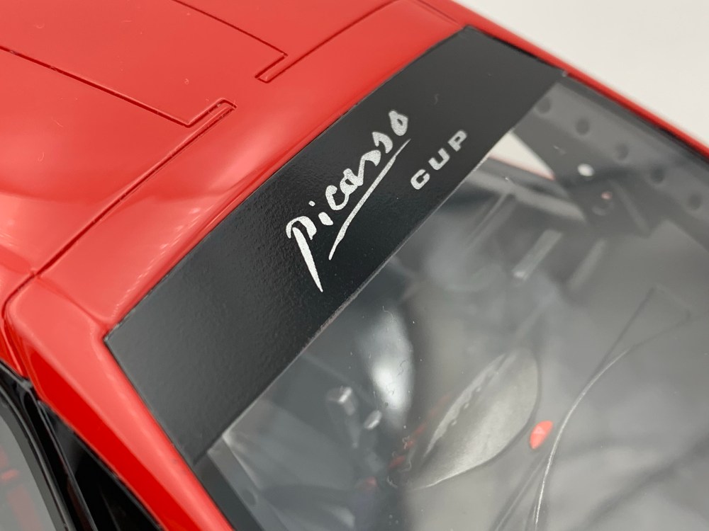 La peinture rouge est très bien appliquée tout comme les nombreuses inscriptions figurant sur la carrosserie. Les vitrages sont bien fixés et nous retrouvons l’inscription Picasso Cup sur le haut du pare-brise. Cette inscription figure également sur les deux ailes avant.