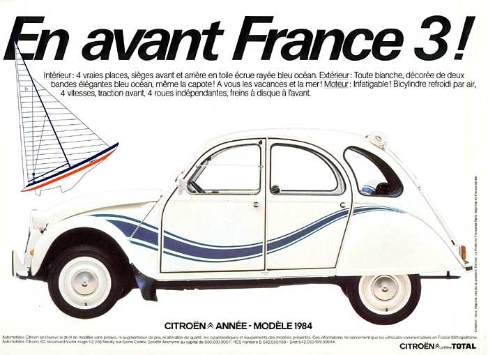 Citroën sponsorise cette année-là le voilier français France 3 qui participe à la Coupe de l’America. La 2CV éponyme accompagne cette opération. Pour chaque vente effectuée, Citroën reversait 500 F pour l’entretien du voilier… qui a d’ailleurs remporté la Coupe !