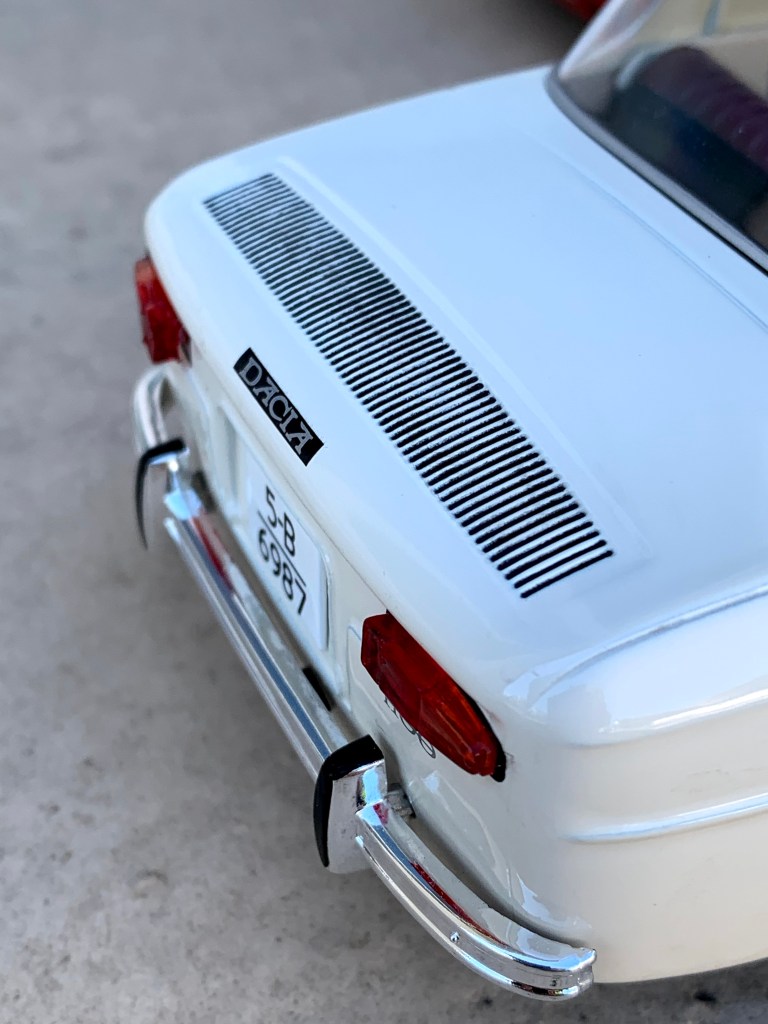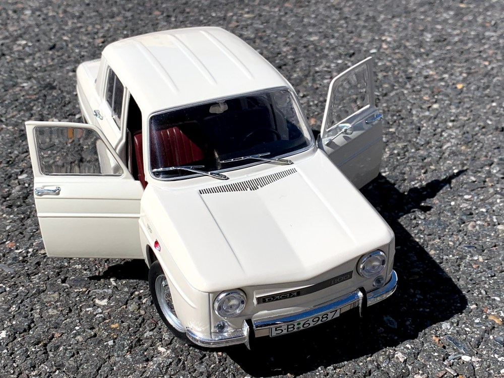 Auteur de plusieurs versions de la Renault 8 au 1/18ème, Solido a eu l’excellente idée d’utiliser son moule pour reproduire à cette même échelle la toute première Dacia de l’histoire, la 1100 !