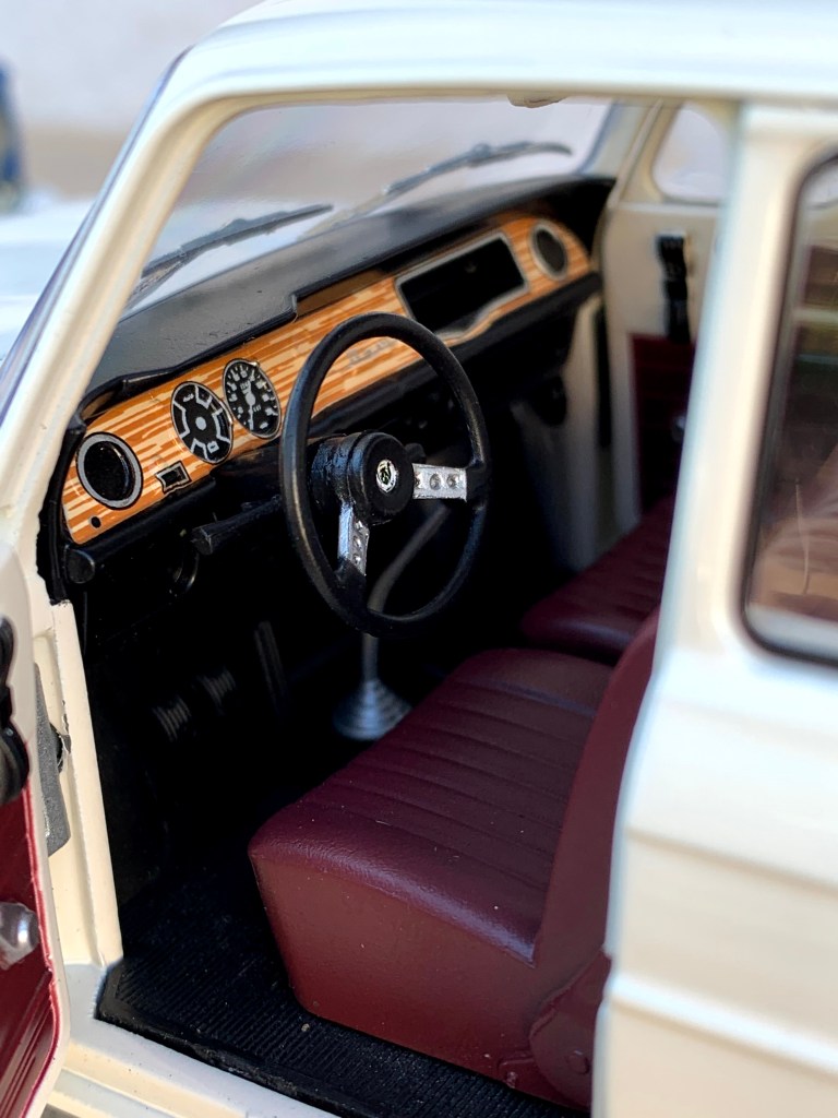 Les portières s’ouvrent sur un très bel intérieur de couleur bordeaux qui se marrie parfaitement avec le blanc de la carrosserie. Sur la planche de bord figure un placage en formica réalisé à l’aide d’un autocollant.