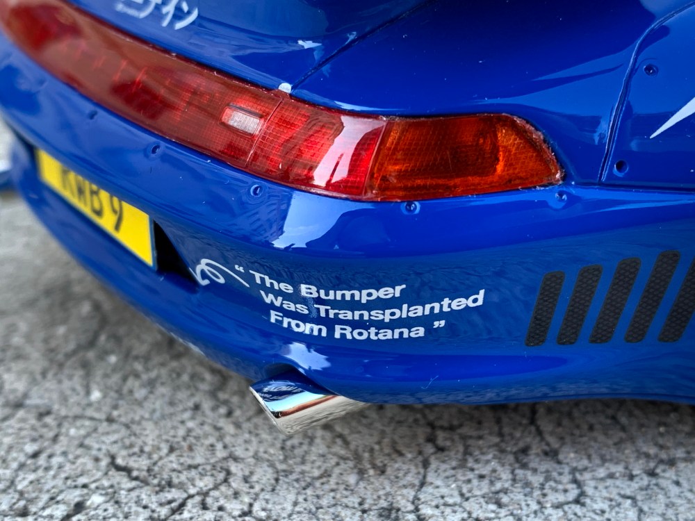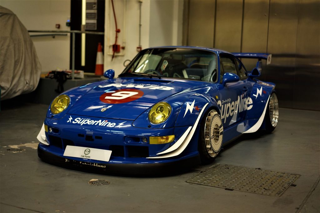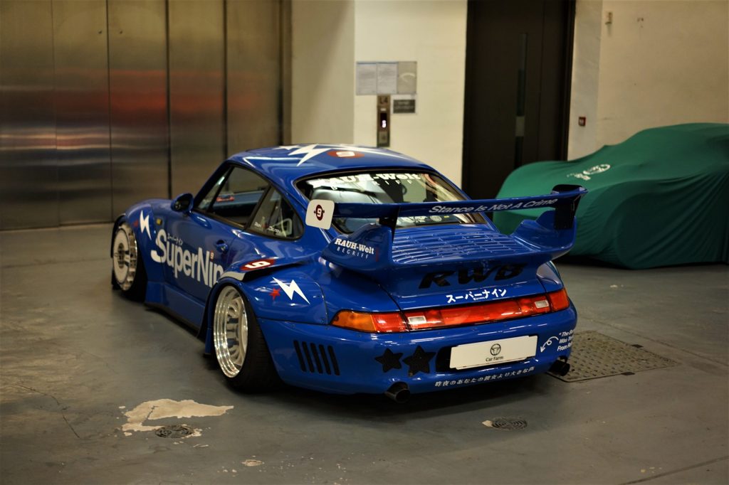 Attention… nous sommes là en présence d’une œuvre d’art ! Bien que certains considèrent les RWB comme du vulgaire tuning, il faut quand même avouer que Akira a réussi à pousser à son paroxysme le style de la 993. Avec sa peinture bleue, ses roues au carrossage négatif, ses nombreux déflecteurs et sa décoration léchée, SuperNine semble tout droit échappée d’un circuit ou d’un manga ! Nous sommes bien loin de l’élégance froide et toute germanique d’une RUF, ici c’est du brut (ne nous méprenons pas, je suis un grand fan des RUF) !
