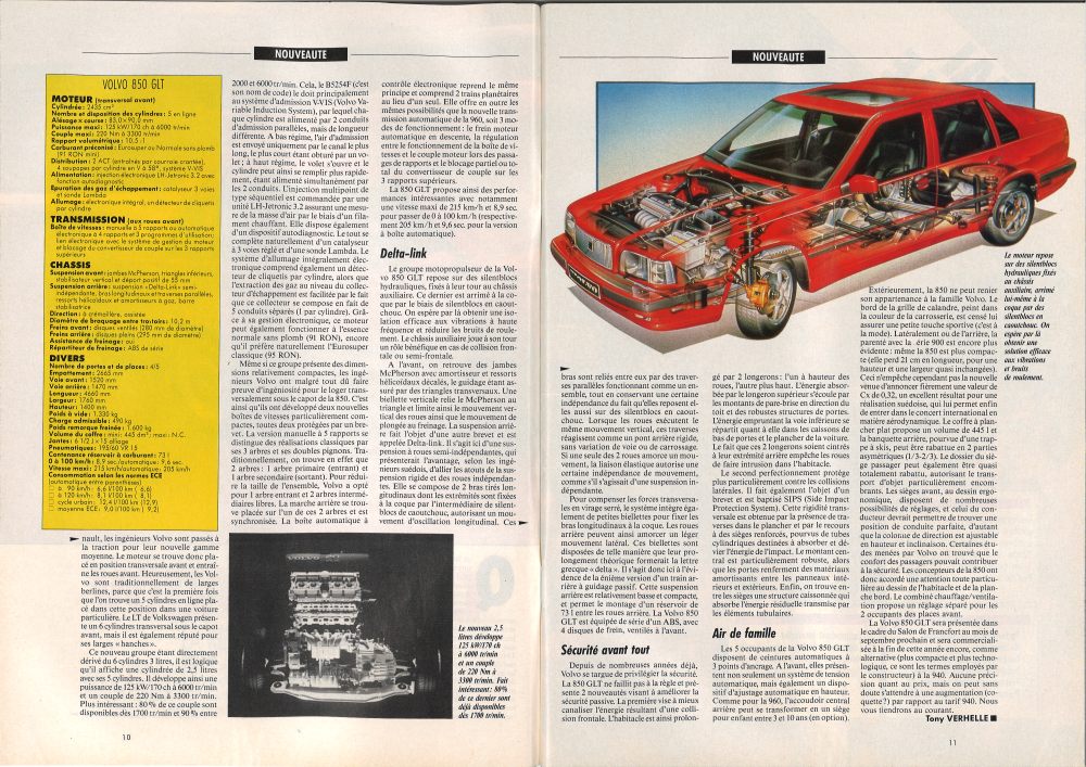 L’Auto-Journal publie l’essai de la berline dans le dernier numéro de l’année 1994. Voici quelques morceaux choisis de l’article signé Jean-Claude Letrou : Quelle mouche a donc piqué Volvo ? Le constructeur suédois a jeté son bonnet par-dessus les moulins, participe à des courses en circuit et commercialise des voitures au tempérament explosif. Ainsi après avoir participé au Championnat britannique des voitures de tourisme avec deux breaks 850 spécialement préparés, Volvo en a extrapolé une série de 2500 versions routières appelées 850 T5-R ».