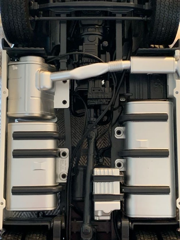 Observons de près la partie mécanique de ce Scania. A l’instar de la cabine, NZG a apporté beaucoup de soins à la réalisation des dessous de son Scania. Entièrement recouvert de gris foncé, le châssis échelle accueille de nombreux éléments mécaniques et accessoires qui permettent d’assurer le bon fonctionnement du Scania.