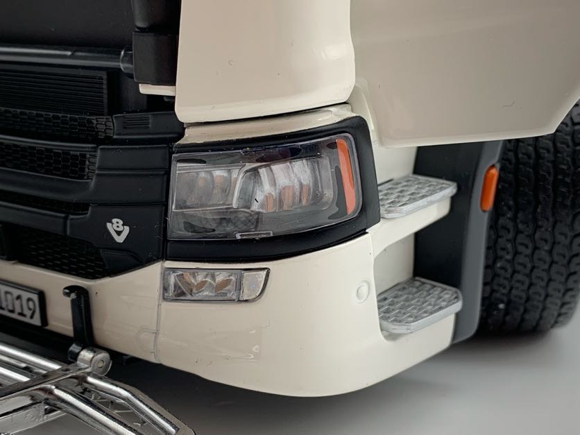 Cette miniature comprend un grand nombre de pièces rapportées. Nous retrouvons comme il se doit des phares et feux réalistes, y compris les feux de position présents sur les carénages disposés de part et d’autre du Scania.