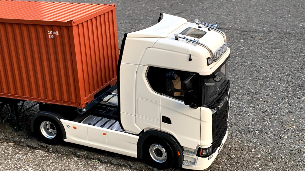 Avec son Actros et plus récemment son Scania 730S, ce dernier a fixé la barre très haut en termes de réalisme et de qualité de fabrication. Cerise sur le gâteau, NZG nous propose depuis peu des semi-remorques à la même échelle pour accompagner ces merveilles. Je vous propose de découvrir en détail ce Scania accompagné, dans une deuxième partie de sa semi-remorque et de son conteneur.
