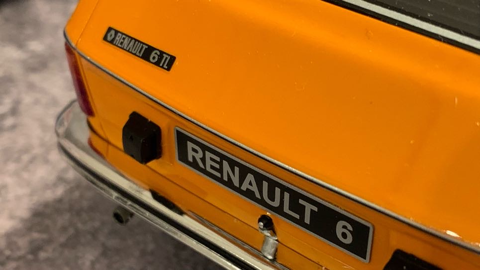 Le marquage Renault 6 TL figurant sur le volet du coffre est très bien réalisé tout comme le losange Renault figurant au centre de la calandre.