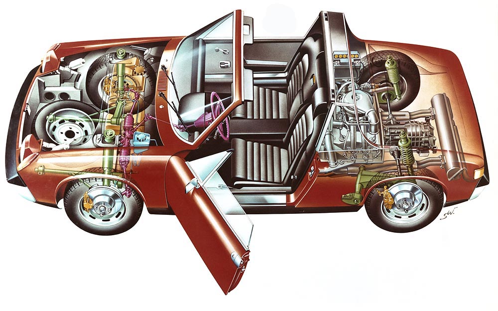 Dénommée VW-Porsche 914, cette nouvelle voiture se distingue par une silhouette atypique et par son toit amovible pouvant être rangé dans le coffre situé à l’arrière. Un deuxième coffre est situé à l’avant.
