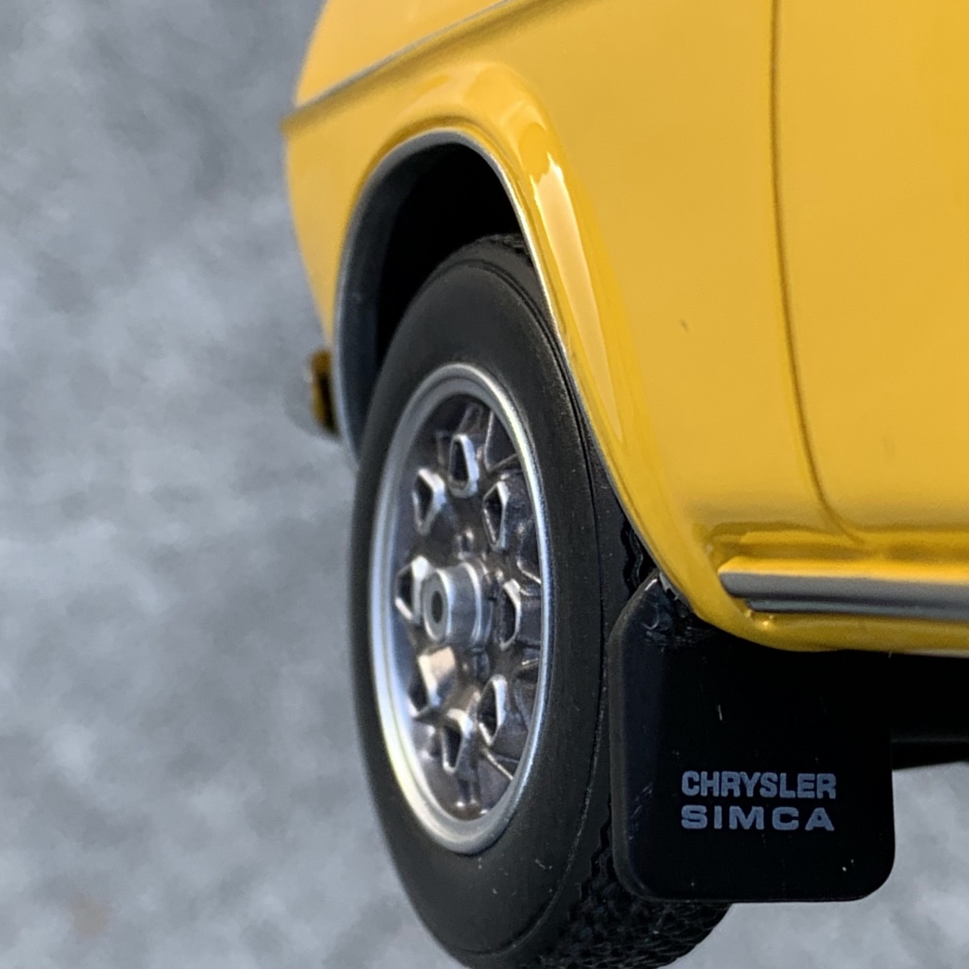 Les jantes en alliage réalisées par Dunlop sont, quant à elles, très réussies ! A noter que, comme pour les versions orange et bleue, cette 1100 est équipée aux quatre roues des bavettes proposées à l’époque au rayon accessoires. Ces dernières sont logotypées Chrysler Simca. Un choix original bien que ne correspondant que peu, selon moi, à la définition sportive de la voiture.
