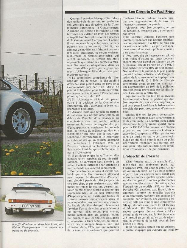 Le célèbre pilote et journaliste automobile belge Paul Frère essaye la 911 SC RS pour le Moniteur Automobile. Ses impressions de conduite sont publiées dans le n°9 du 12 juillet 1984. En voici quelques extraits : « Par rapport à la 911 SC de série, la puissance du moteur est portée de 204 à 255 chevaux. […] Le système d’échappement comporte d’ailleurs deux sorties supplémentaires, normalement bouchées, dont l’ouverture court-circuite le silencieux et augmente la puissance d’une trentaine de chevaux. […] Le train roulant correspond en principe à celui de la 911 Turbo, avec freins du type 917, voie arrière large et roues en aluminium forgé de 7 pouces à l’avant et 8 pouces à l’arrière, ce qui implique aussi les ailes avant et arrière élargies de la Turbo. […] Son prix est de 190.000 marks, soit trois fois plus qu’une Carrera 3.2 et le double d’une Turbo. […] Tournez la clé de contact et la première chose qui frappe est que le bruit est plus intense que dans une 911 de série. […] Je passe la première et avance jusqu’au premier feu rouge. Quelques centaines de mètres en plus et il devient évident que la suspension n’a rien d’une berceuse, même si, une fois sorti de l’agglomération, on constate qu’elle devient plus confortable à mesure que la vitesse augmente. […] Je suis frappé par la légèreté de la direction qui, contrairement aux autres commandes, demande moins d’effort que dans une 911 de production. […] Je tire à fond sur les rapports intermédiaires, les 100 km/h sont atteints en 5 secondes justes et le kilomètre départ arrêté, en 24,4 secondes. Dans le trafic urbain, le moteur est d’une remarquable docilité, mais il ne s’éveille vraiment qu’à partir de 4500 tours/minute : c’est alors une véritable envolée jusqu’à la limite des 7600 tours/minute autorisés. […] Il faut pas mal d’attention er d’incessantes corrections pour la maintenir sur une trajectoire rectiligne et des grandes courbes d’autoroute se prenant à 200 km/h et plus, sans aucun problème, avec ma voiture, font ressortir un comportement fort pointu requérant beaucoup d’attention […] en revanche, sur les petites routes, la RS est vraiment dans son élément et donne l’impression que plus rien n’est impossible. Elle s’accroche littéralement à la route et sa réponse immédiate aux moindres mouvements du volant la rend merveilleusement agile, surtout si l’on sait habilement exploiter la réaction de survirage qui se produit lorsque, dans le virage, on coupe les gaz ou relève simplement le pied. Avec un tel comportement et les chevaux disponibles, on est véritablement le roi de la route ».