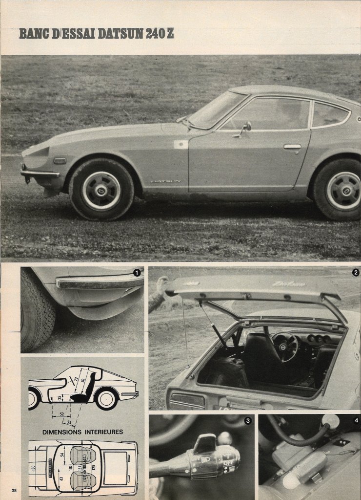 André Costa essaye pour l’Auto-Journal (n°1 du 15 janvier 1972) la 240Z et nous dit d’elle que « grâce au tonus de son moteur, à une très bonne position de conduite, à la douceur et à la précision de sa conduite ainsi qu’à sa docilité générale, la 240Z est très agréable à conduire sur un itinéraire sinueux tandis que sa longue cinquième et sa parfaite stabilité à très grande vitesse autorisent de longues randonnées sur autoroute, sans fatigue et avec le secours d’une bonne radio que l’on peut continuer à écouter à 200 à l’heure ».