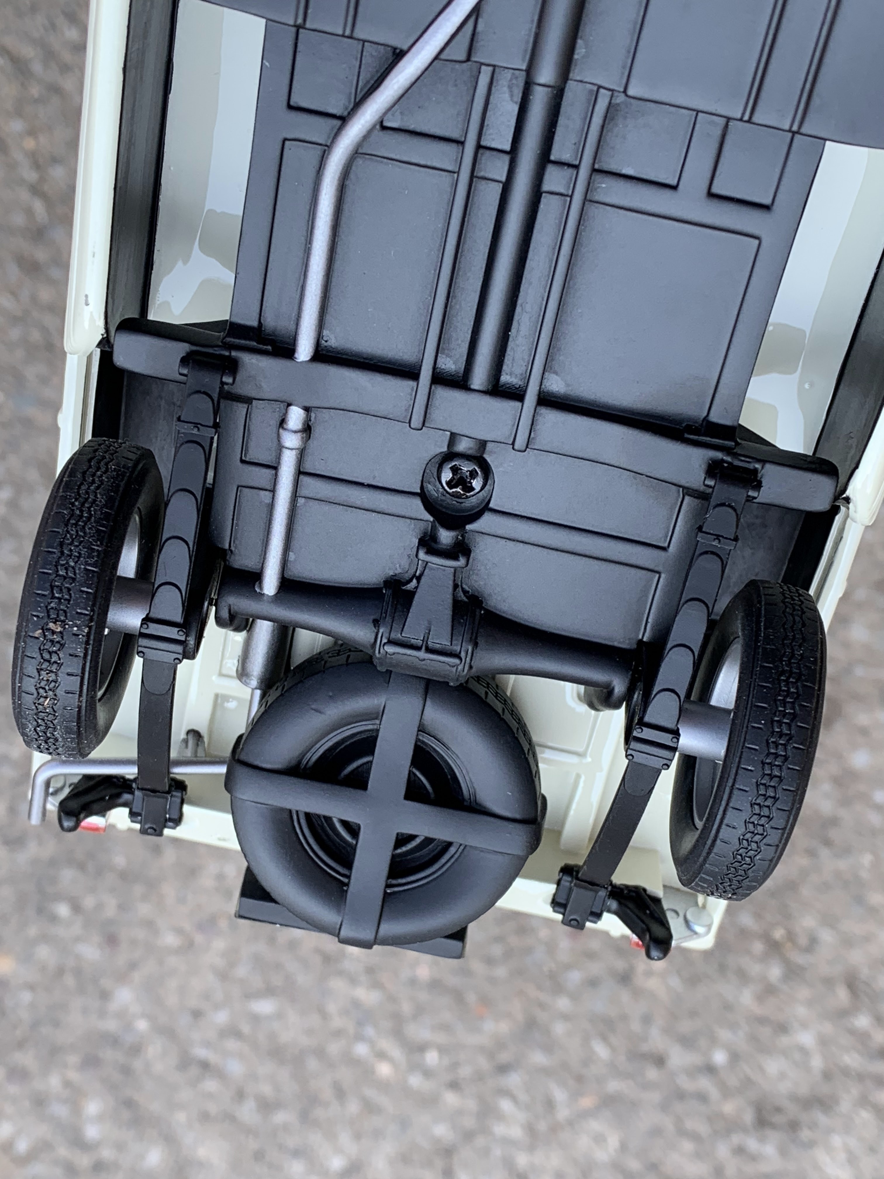 Les roues du pick-up étaient de simples jantes pleines en tôle qui sont parfaitement reproduites sur cette miniature. Je regrette néanmoins leur aspect légèrement trop brillant qui détone un peu sur cet utilitaire. Les pneus sont également bien réalisés et les roues tournent librement ce qui, pour moi, est toujours un point important sur une miniature.