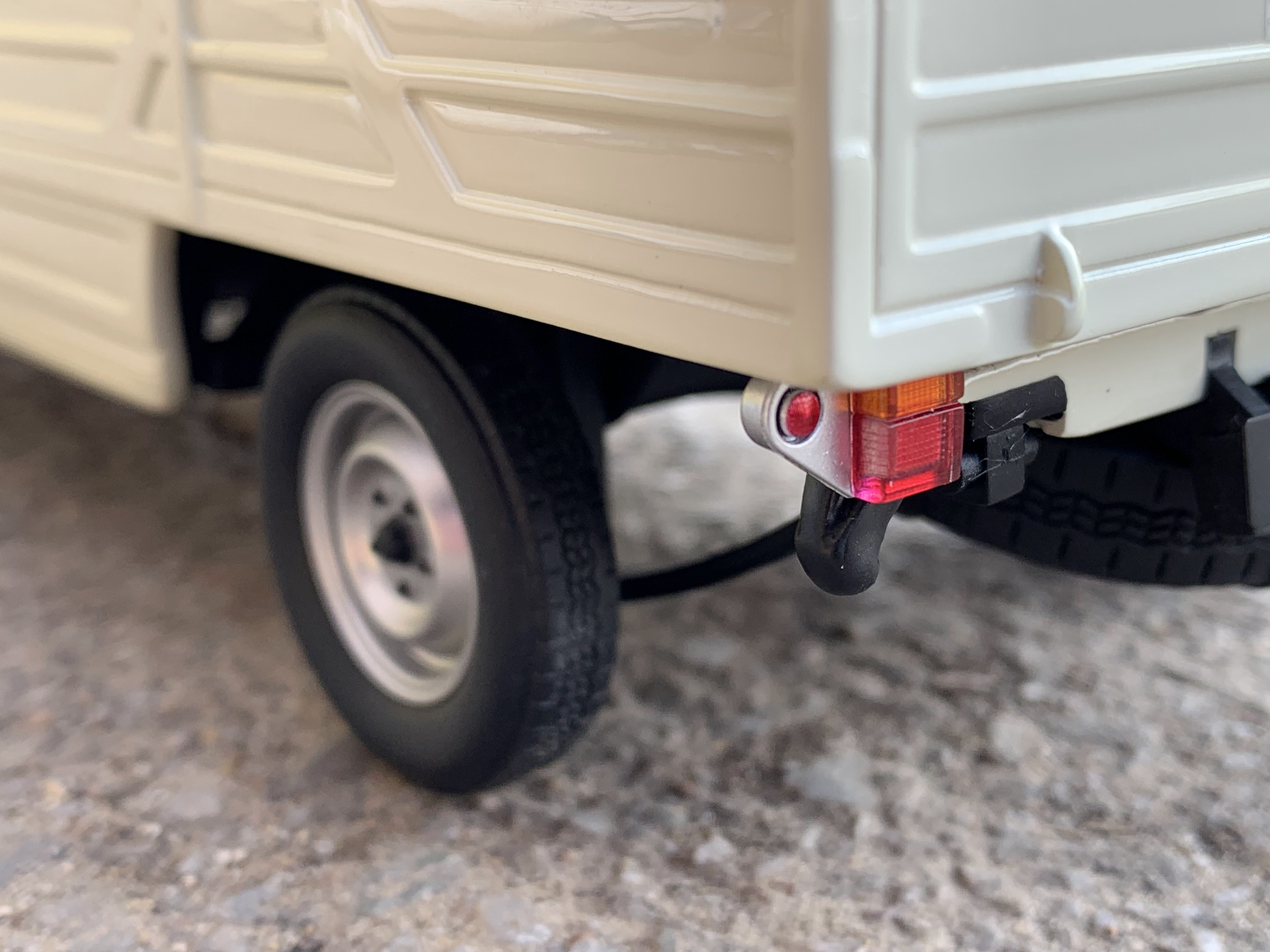OttOmobile a installé deux rétroviseurs extérieurs chromés – contre un seul sur les modèles à l’échelle Un – et le pare-brise arbore des essuie-glaces en plastique gris manquant un peu de finesse. Les portières sont équipées de leurs jolies poignées chromées héritées de la berline et nous retrouvons à l’arrière, sous la benne, de simples et sobres feux carrés bien réalisés.