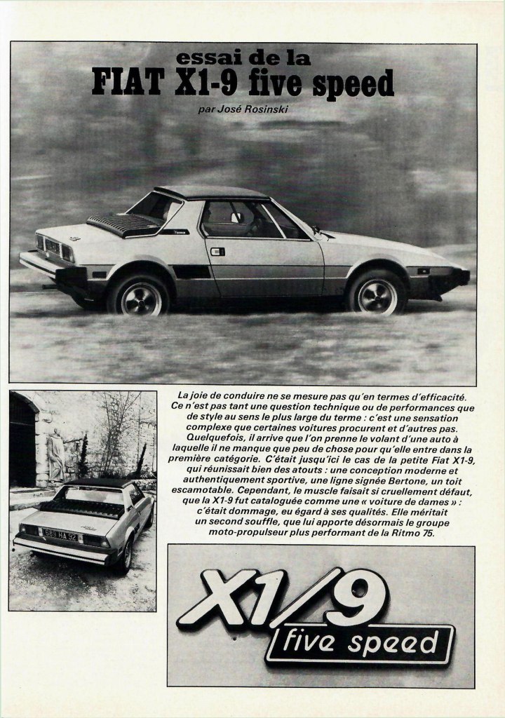 « Nez à l’intérieur, dans une agréable dérive, la Fiat s’enroule avec élégance et prestance autour du virage… contre braquage en vue de la sortie, la trajectoire s’élargit, la dérive cesse, la voiture est déjà placée pour le virage suivant : un vrai régal »… c’est avec ces mots que José Rosinski nous présente la Fiat X1/9 dans le magazine Sport Auto ! Une voiture à redécouvrir…