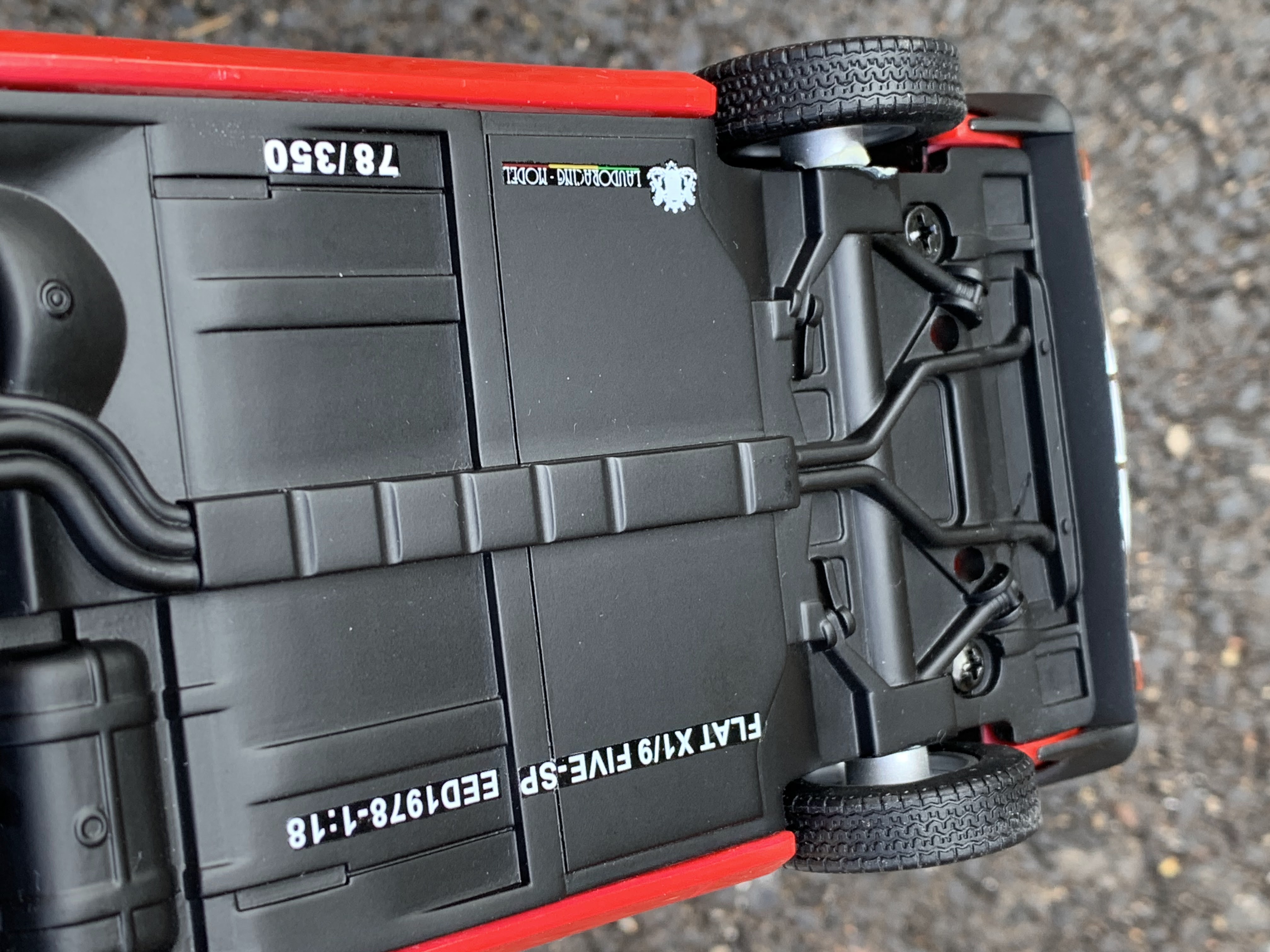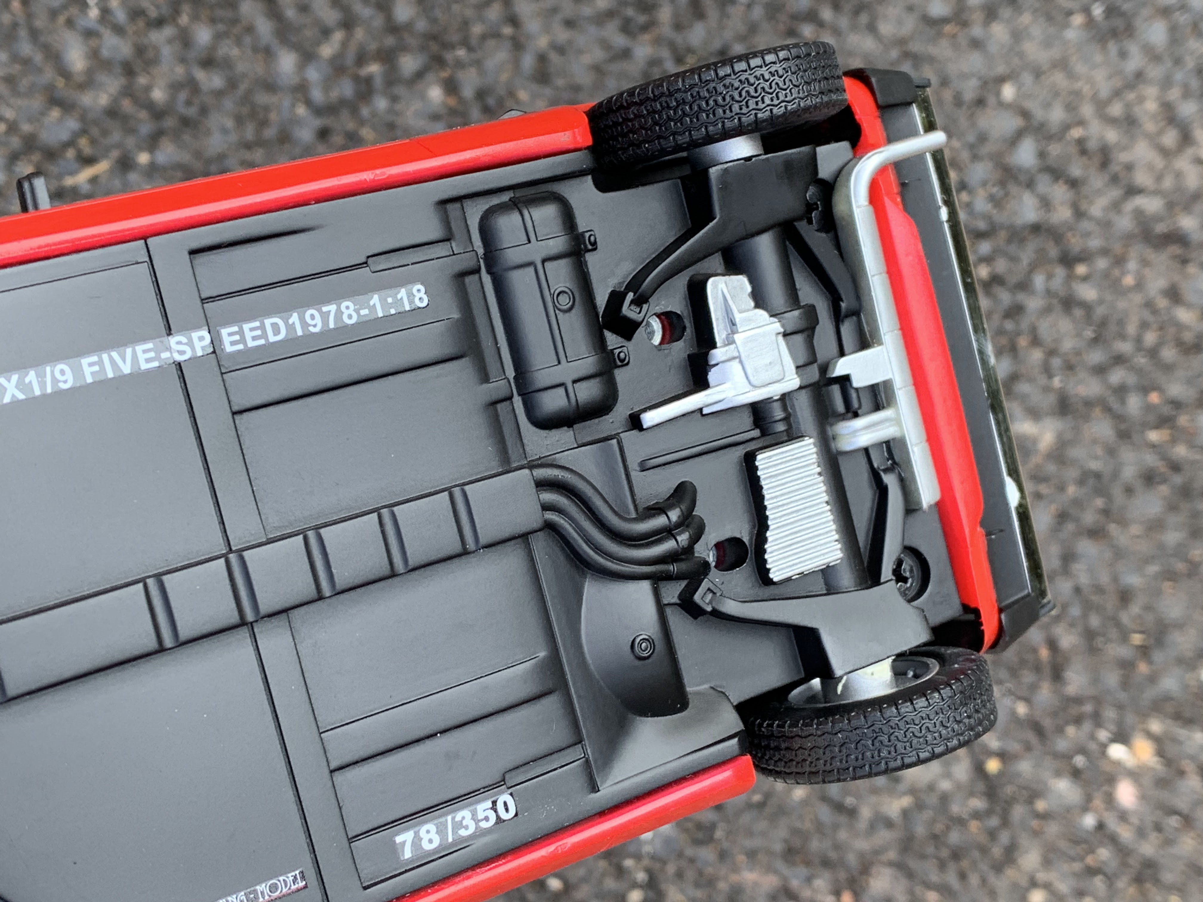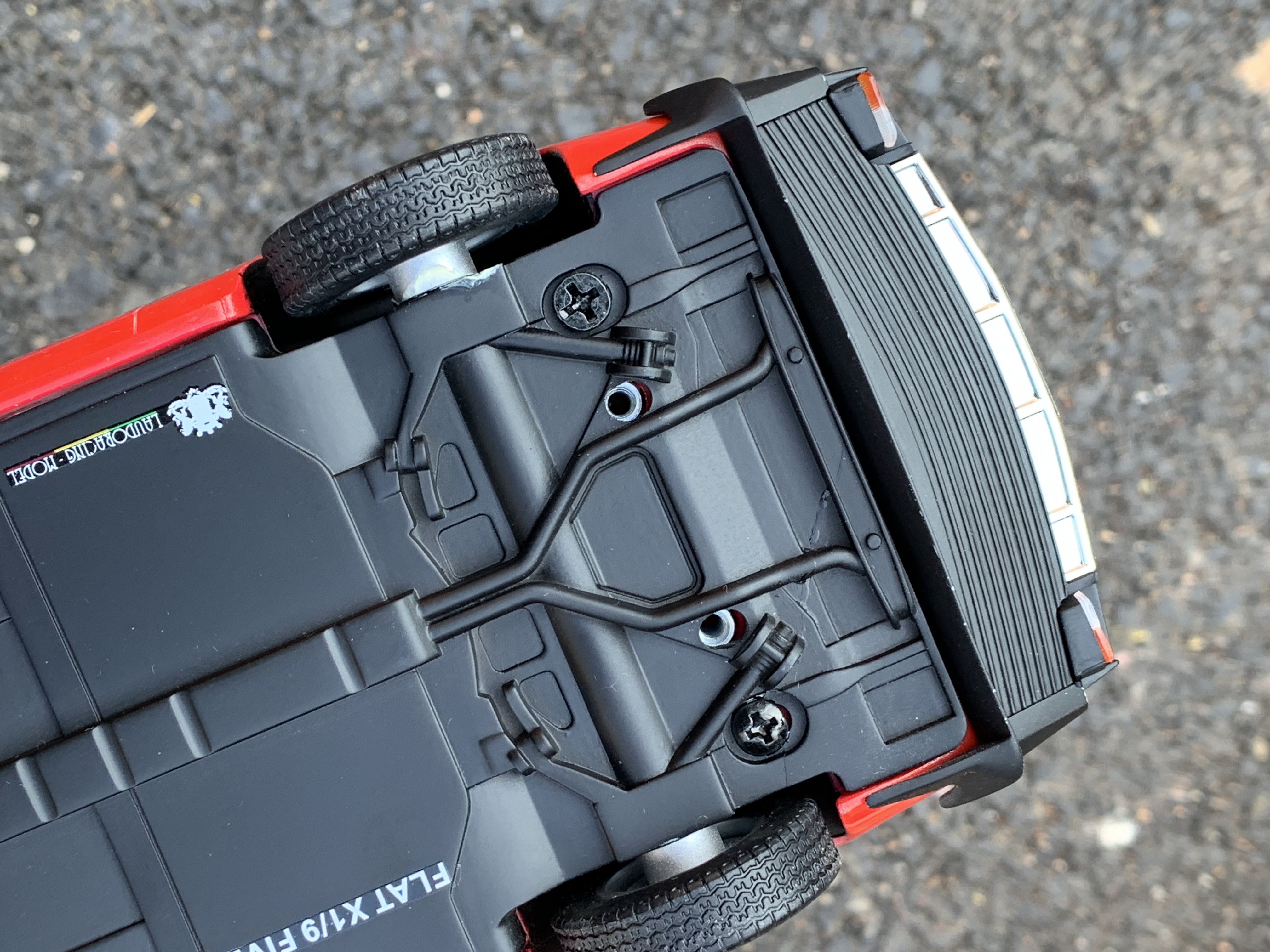 De nombreuses pièces rapportées ont été montées sur cette Fiat. Les plus visibles sont bien entendu les fameux pare-chocs US. Bien plus proéminents que les frêles pare-chocs d’origine, ils donnent à la X1/9 un côté plus costaud et plus dynamique grâce au spoiler monté à l’avant. Ces pare-chocs sont particulièrement bien réalisés sur la miniature.