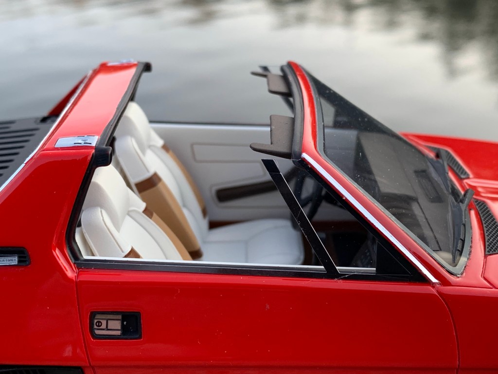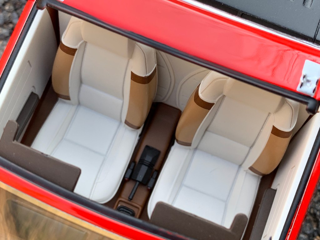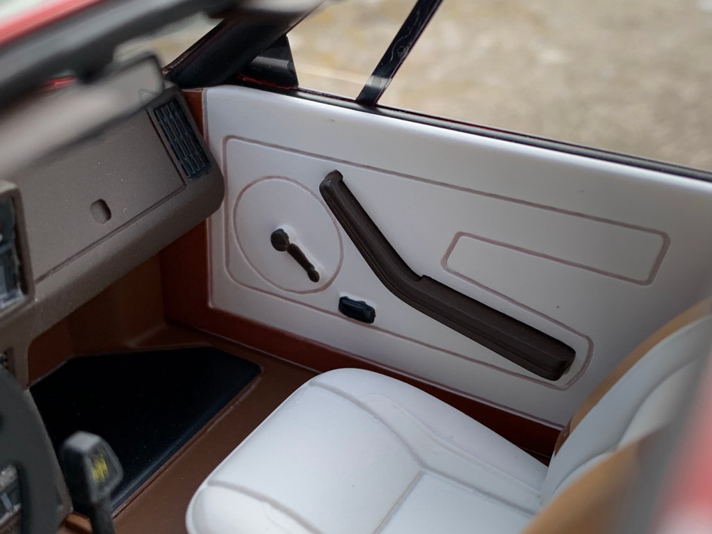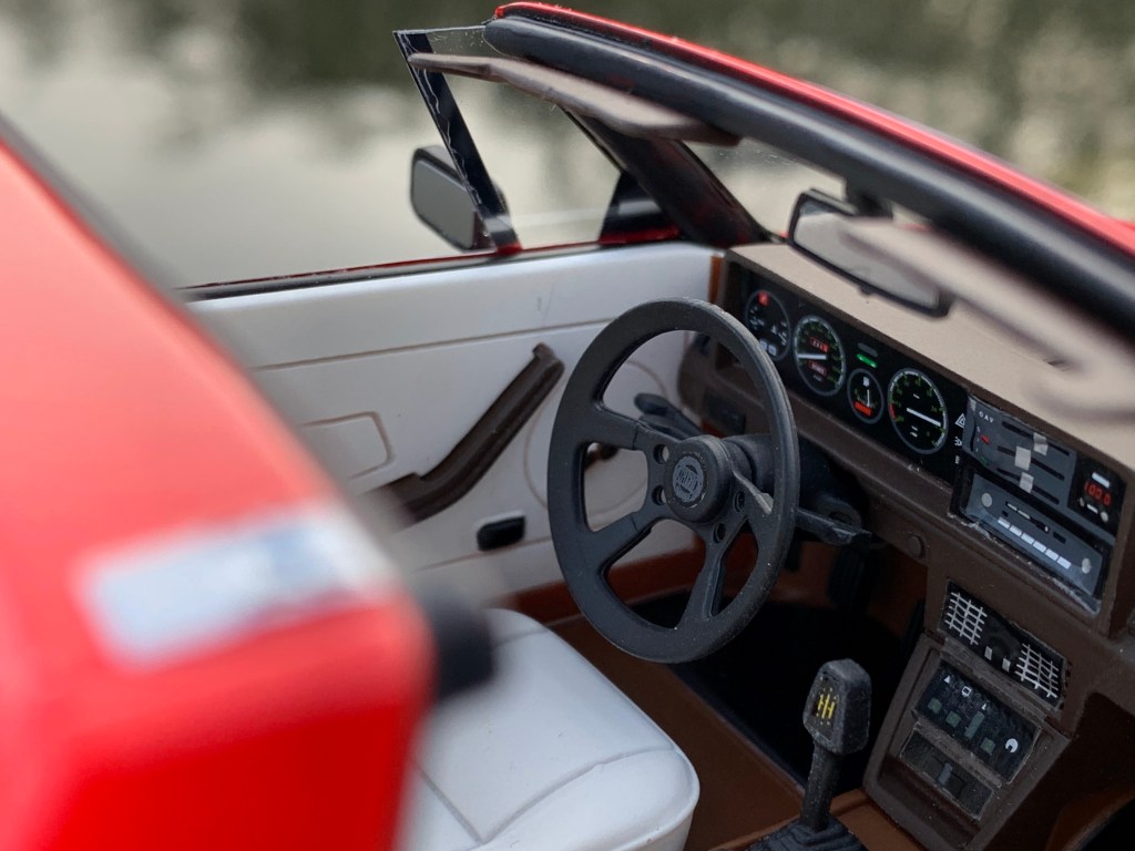 La X1/9 Five Speed héritait d’une nouvelle planche de bord comprenant une large visière rectangulaire que nous retrouvons comme il se doit à l’intérieur de cette miniature. Le toit étant ôté, nous pouvons à loisir détailler les nombreux compteurs, la nouvelle console centrale et l’énorme levier de vitesses. Ce dernier semble disproportionné mais il en était de même sur la version à l’échelle Un qui avait renoncé à la jolie boule des premiers modèles.