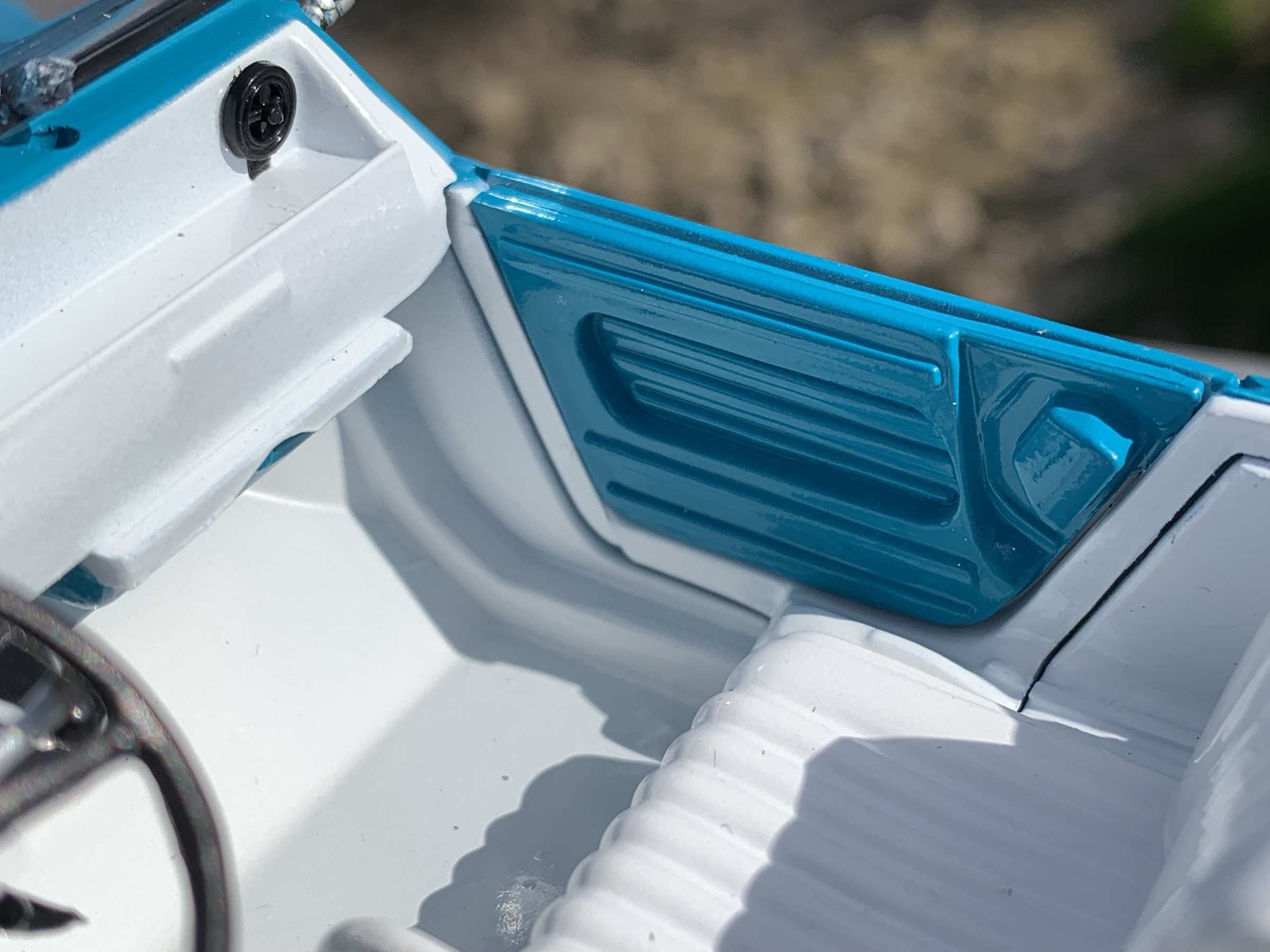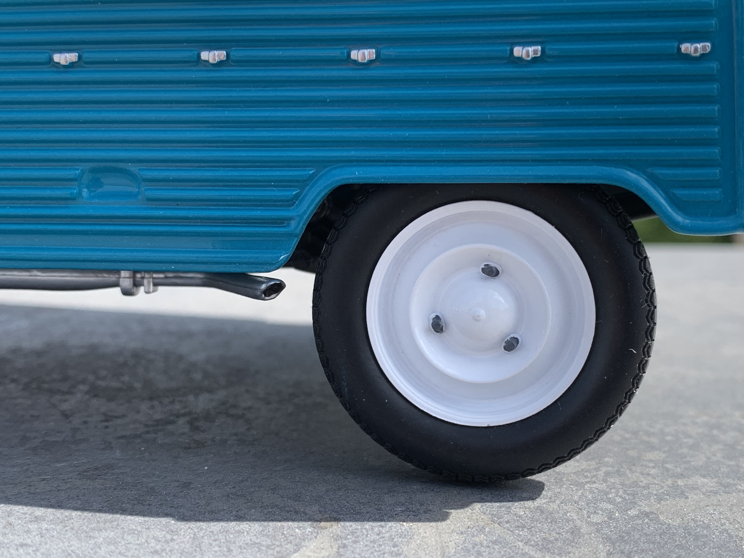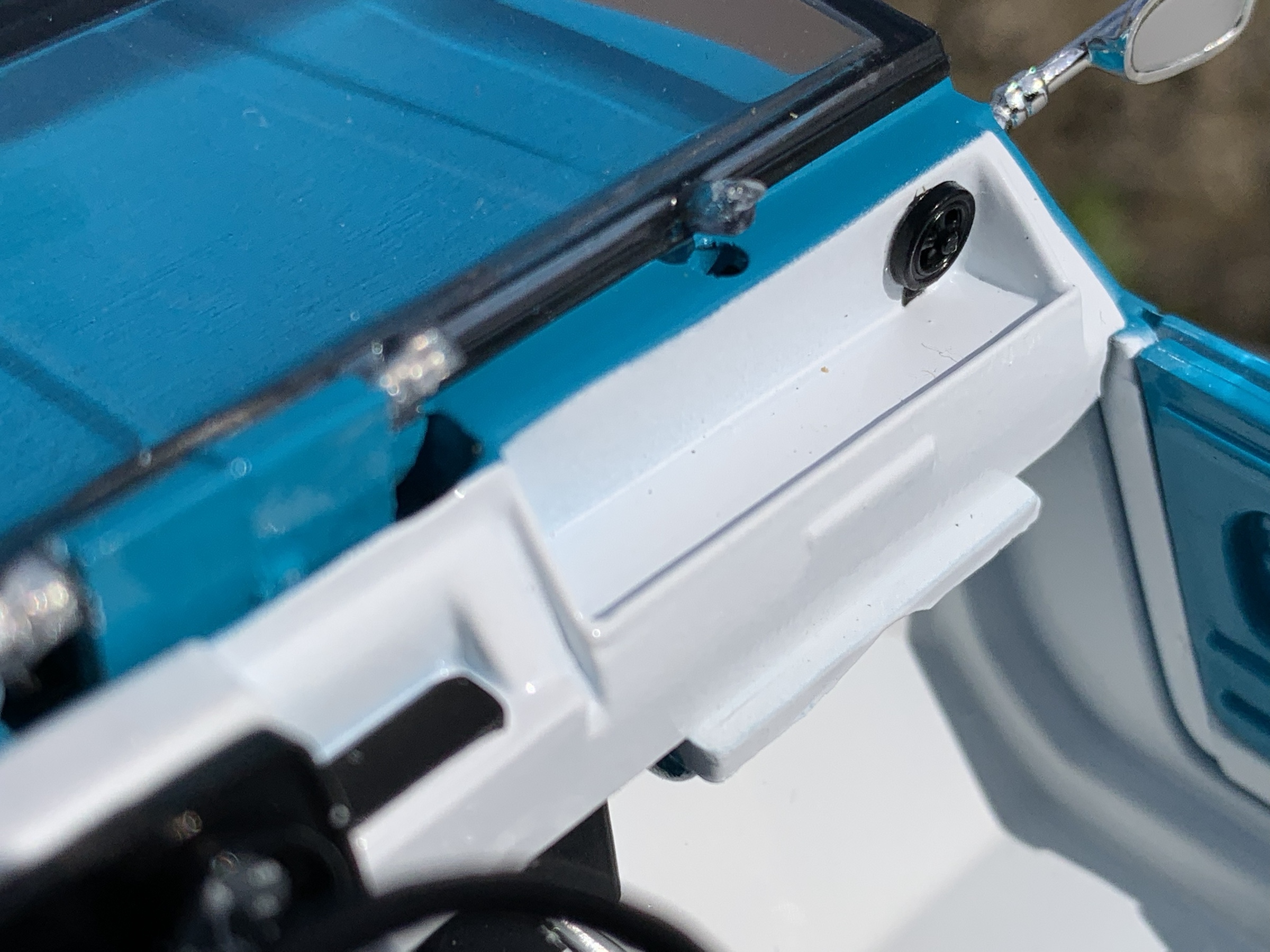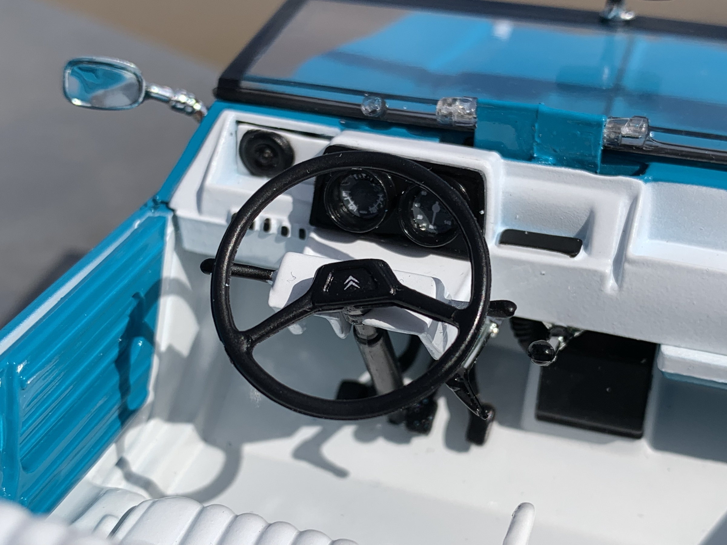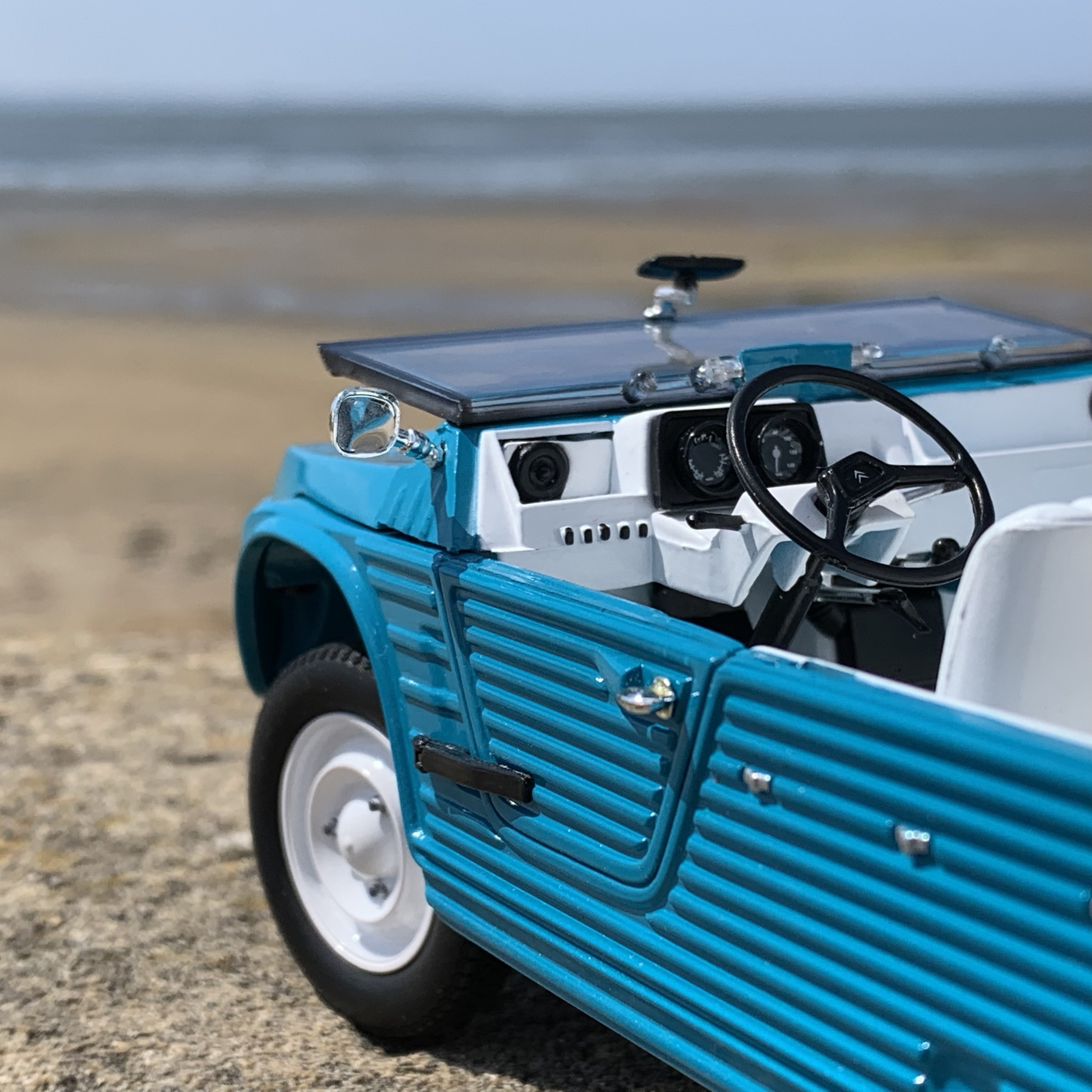 Entièrement réalisée en plastique, elle peut, comme sur le modèle à l’échelle Un, être présentée toit en place ou entièrement découverte, pare-brise rabattu.