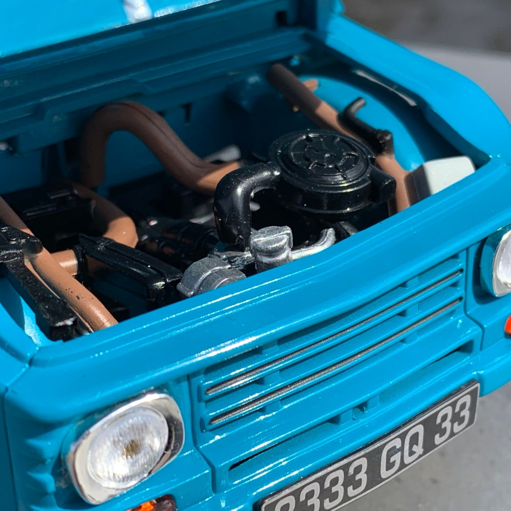 Son capot moteur est ouvrant et abrite un moteur bien réalisé.