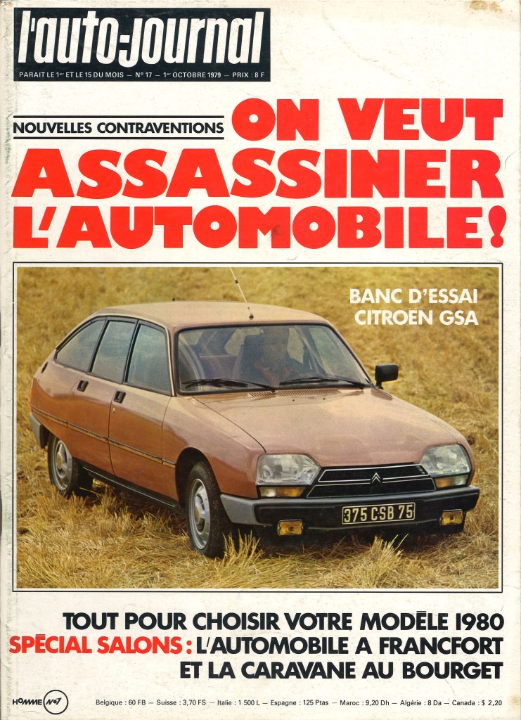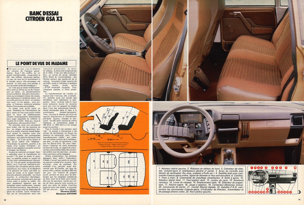 Dans l’Auto-Journal n°17 du 1er octobre 1979, André Costa écrit : « Par rapport à la GS 1220 désormais abandonnée, le progrès général est considérable : +17 km/h en vitesse de pointe, près de 3 secondes au 1000 mètres départ arrêté, cela avec des consommations à vitesse égale en baisse. Il faudrait donc être exigeant pour ne pas s’estimer satisfait par une telle évolution. […] Sur la nouvelle GSA, l’évolution des réglages de suspension parait avoir encore amélioré un comportement déjà remarquable. […] C’est sans doute en raison du confort de sa suspension – dont une clientèle volontiers rassie se régale – que la GS est souvent considérée comme une voiture de deuxième âge. […] Mais la grande affaire, en ce qui concerne au moins le regard, c’est le nouveau tableau de bord. Il présente entre autres et face au conducteur un profil « technique » de la voiture qui, convenablement garni de repères lumineux, indique non seulement au « commandant de bord » ce qui ne va pas, mais pousse l’attention jusqu’à lui indiquer la position de l’organe défaillant. […] En dehors de cette centrale d’information « personnalisée », la GSA bénéficie également des services de deux « satellites » du genre Visa (lire aussi l’article consacré à la Visa) […] il n’est pas certain que l’effet esthétique soit particulièrement heureux mais, après une période de cafouillages variés qu’il faudra avoir la patience de supporter, ce dispositif présente très certainement des avantages importants, toutes les commandes se retrouvent à portée de doigts du pilote, sans que la main ait à quitter le volant.