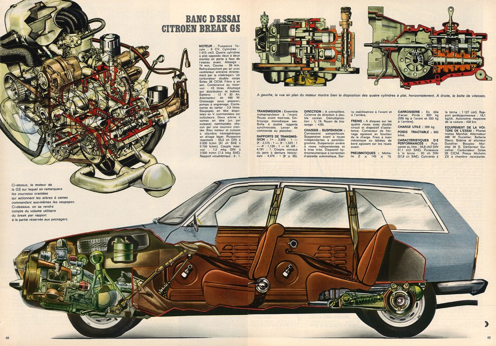 Voici par ailleurs quelques extraits de son essai : « La pièce maîtresse de cette voiture demeure sa suspension hydropneumatique réglable en hauteur, particulièrement précieuse lorsqu’il s’agit de transporter une charge importante : en effet, la voiture reste toujours bien horizontale quel que soit le poids sur l’arrière. […] A vide le break se comporte exactement comme la berline et va vite, après une longue lancée. On ne s’ennuie pas au volant car il faut sans cesse se maintenir à des régimes élevés et les changements de vitesse sont très fréquents. En charge, le manque de puissance à régime moyen se fait cruellement sentir et l’étagement de la boite de vitesses devient inadapté. […] En côte il faut souvent descendre jusqu’à la seconde. Pour une voiture destinée à être chargée, il aurait sans doute fallu que Citroën adopte un pont un peu plus court, quitte à consommer davantage. »
