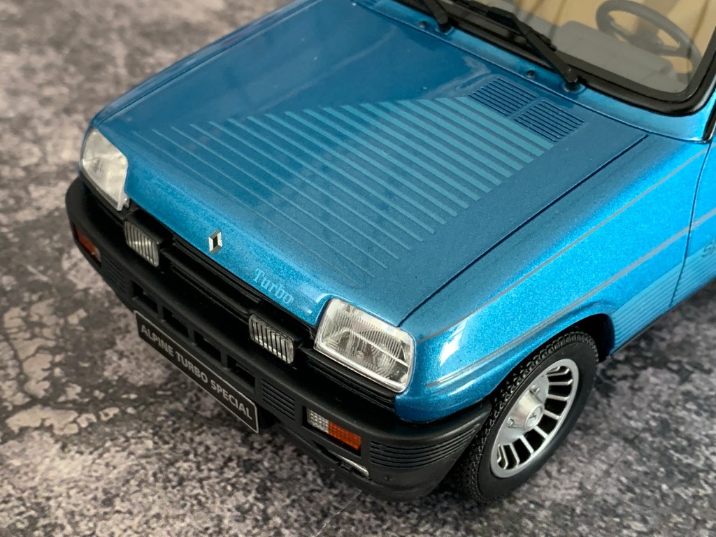 Réalisée en résine, la Renault 5 Alpine Turbo d’OttOmobile est fidèle aux lignes du modèle à l’échelle Un. La peinture, le célèbre Bleu Alpine, est appliquée avec soin et les vitrages sont parfaitement intégrés. Un petit bémol cependant, les bandes noires ceinturant ces vitrages me paraissent beaucoup trop épaisses et nuisent à la finesse de la miniature (un défaut relevé également sur la récente GS break du même fabricant).