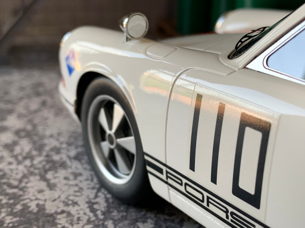 Cette 911 est réalisée en résine et ne dispose pas de parties ouvrantes. Elle bénéficie d’une très belle décoration conforme au modèle à l’échelle Un. La fabrication est soignée, nous sommes véritablement en présence d’un modèle haut de gamme comme en témoignent la finesse de la gravure et des pièces rapportées, à commencer par les essuie-glaces.