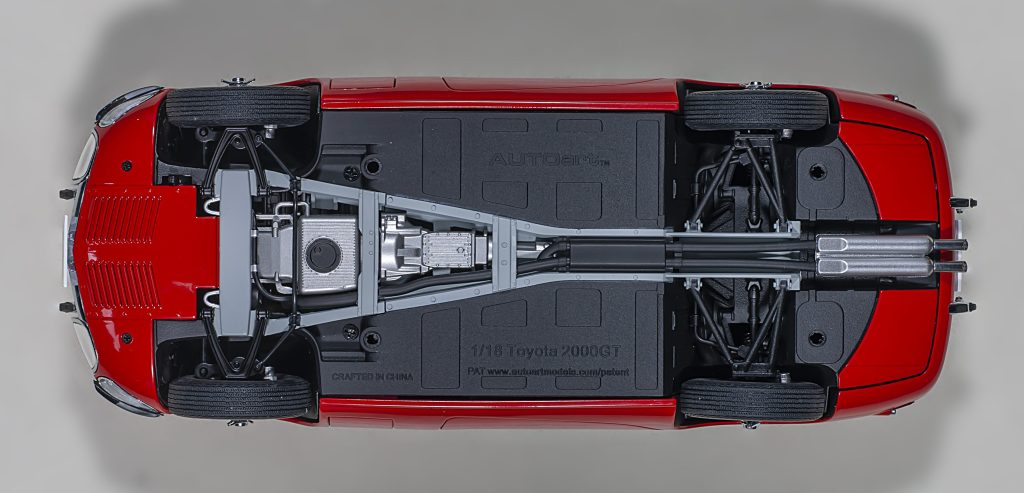 La Toyota 2000 GT était équipée de jantes à voile plein et rares sont celle à avoir été équipées de jantes à rayons. Il faut dire que ces dernières étaient un peu passées de mode à la fin des années 60. Contrairement aux premières éditions de la 2000 GT fabriquées par AUTOart qui étaient équipées des jantes traditionnelles montées sur le coupé, cette nouvelle édition est équipée de ces très belles jantes à rayons. Certains aimeront, d’autres pas…