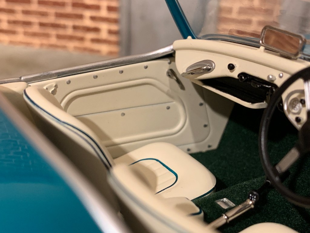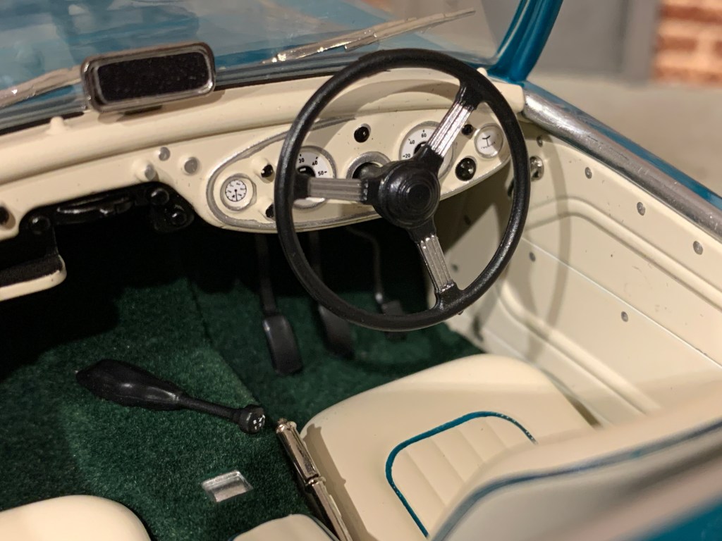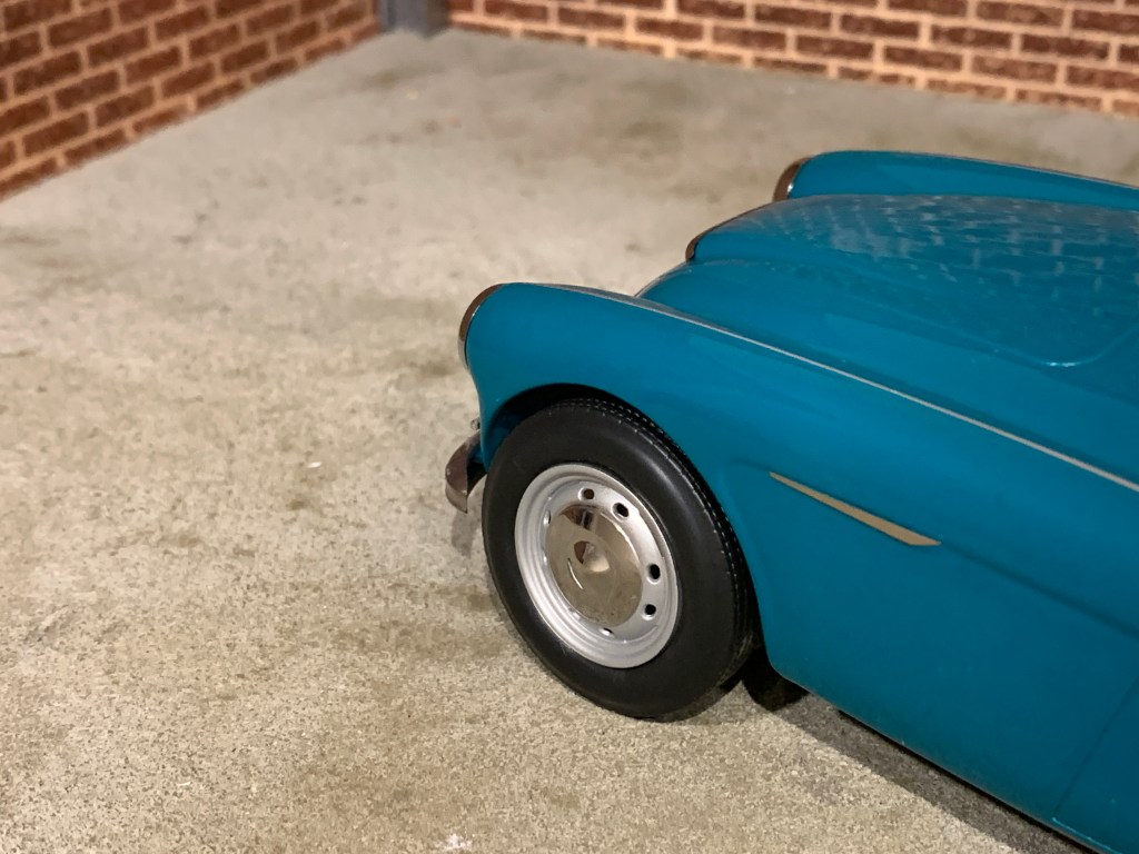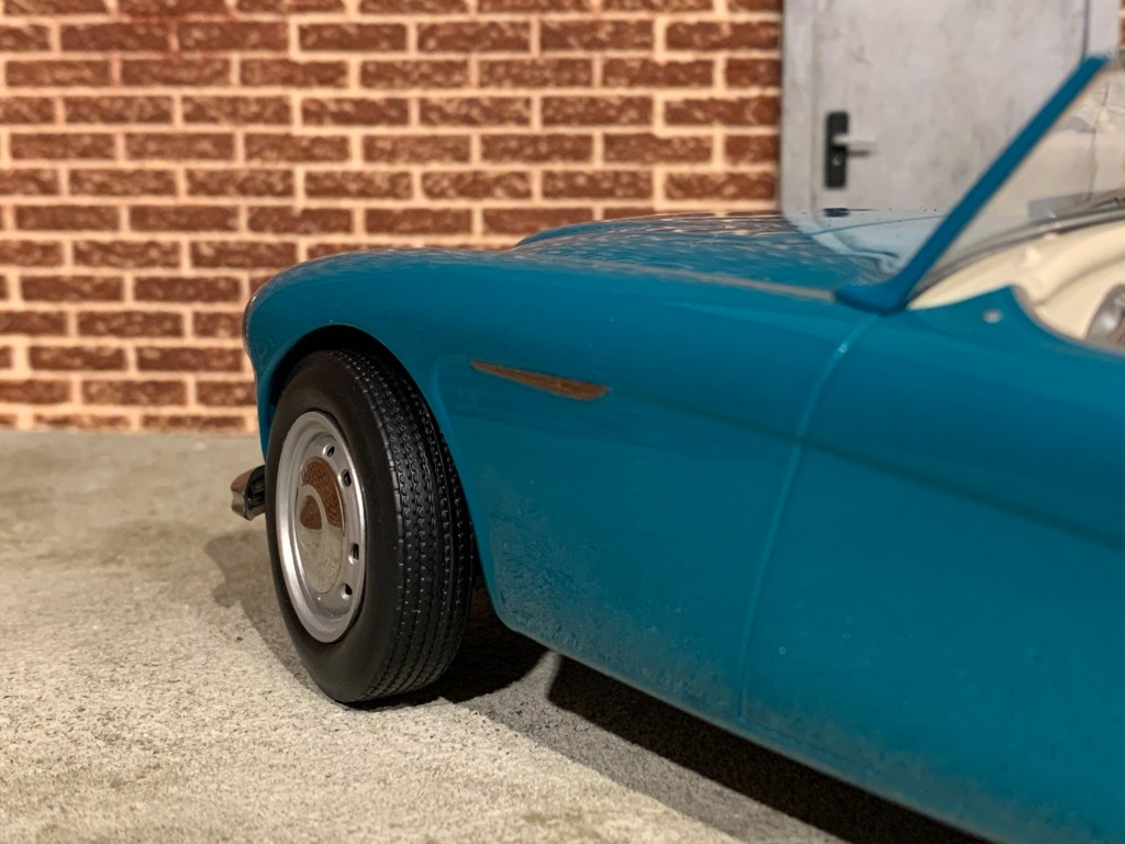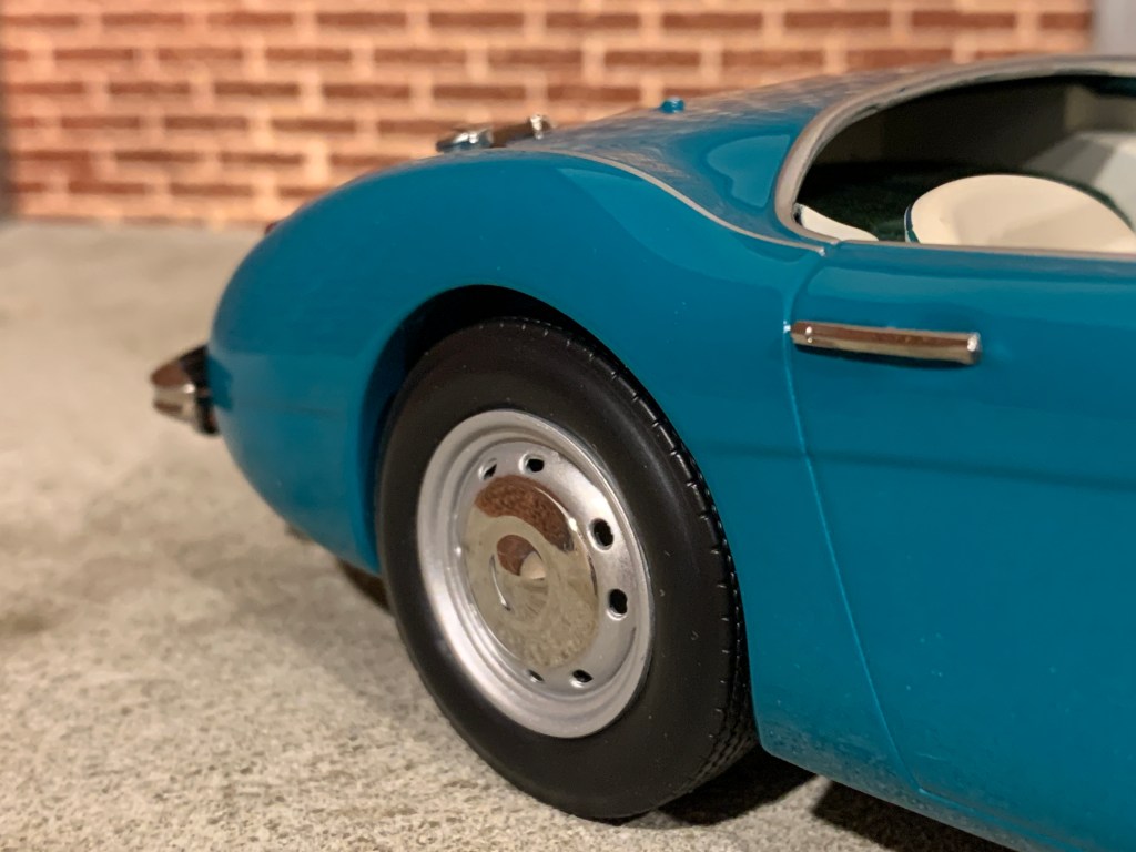 Norev a fait le choix d’équiper sa Mk1 des jolies jantes en tôle qui étaient montées d’origine. Une combinaison plutôt rare, les Austin Healey étant bien souvent équipées des roues fils si typiques des années 50 et 60 (la Mk2 proposée par le fabricant est quant à elle équipée de ces fameuses roues).