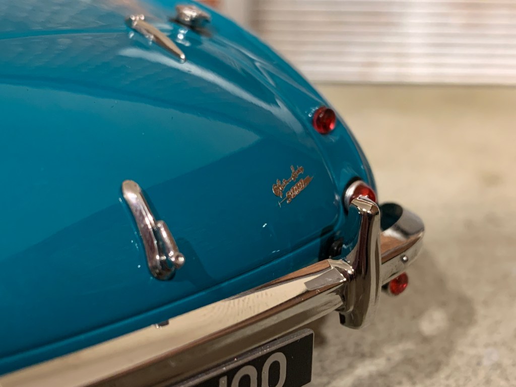Nous retrouvons sur la miniature la calandre en retrait, le petit pare-brise incliné (il était inclinable sur les toutes premières Austin Healey 100) et le coffre qui descend en pente douce à l’arrière.