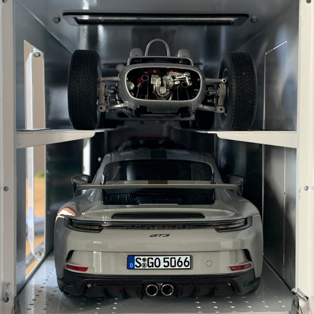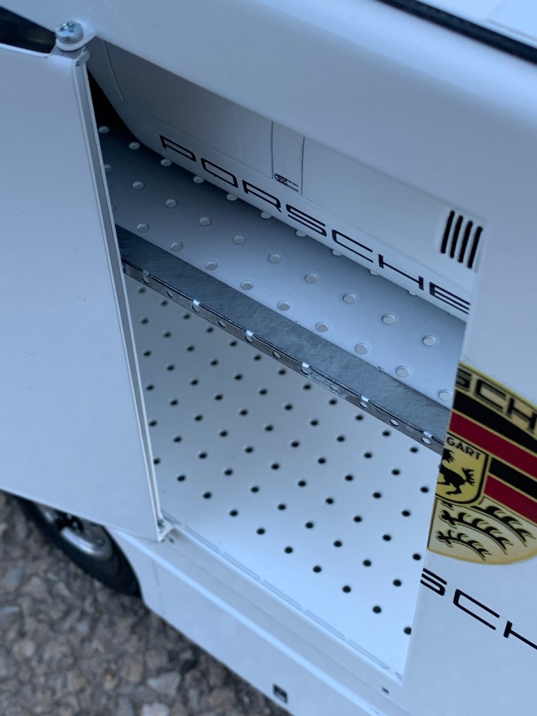 Ma première préoccupation est de tester l’intégration des voitures à l’intérieur. Pas de soucis pour le premier niveau, une 911 rentre sans problème et il reste même un peu de place au dessus du pavillon. Mon stress est plutôt sur le niveau supérieur… La 917 et la 956 rentrent sans problème !!! Ouf…