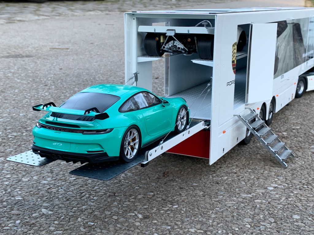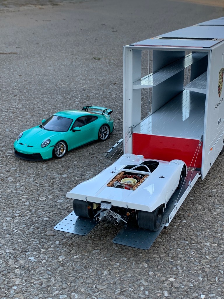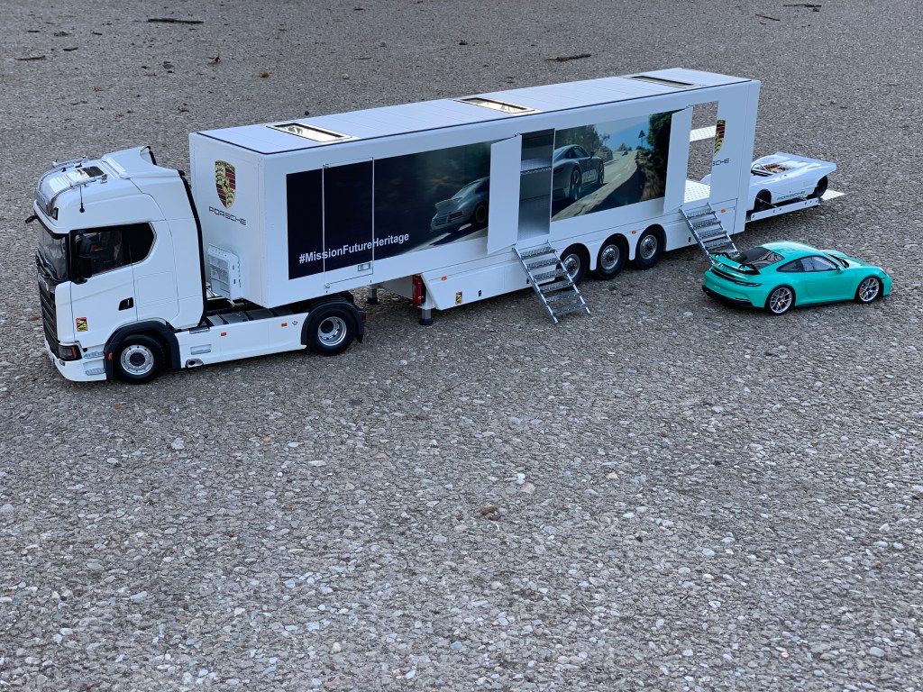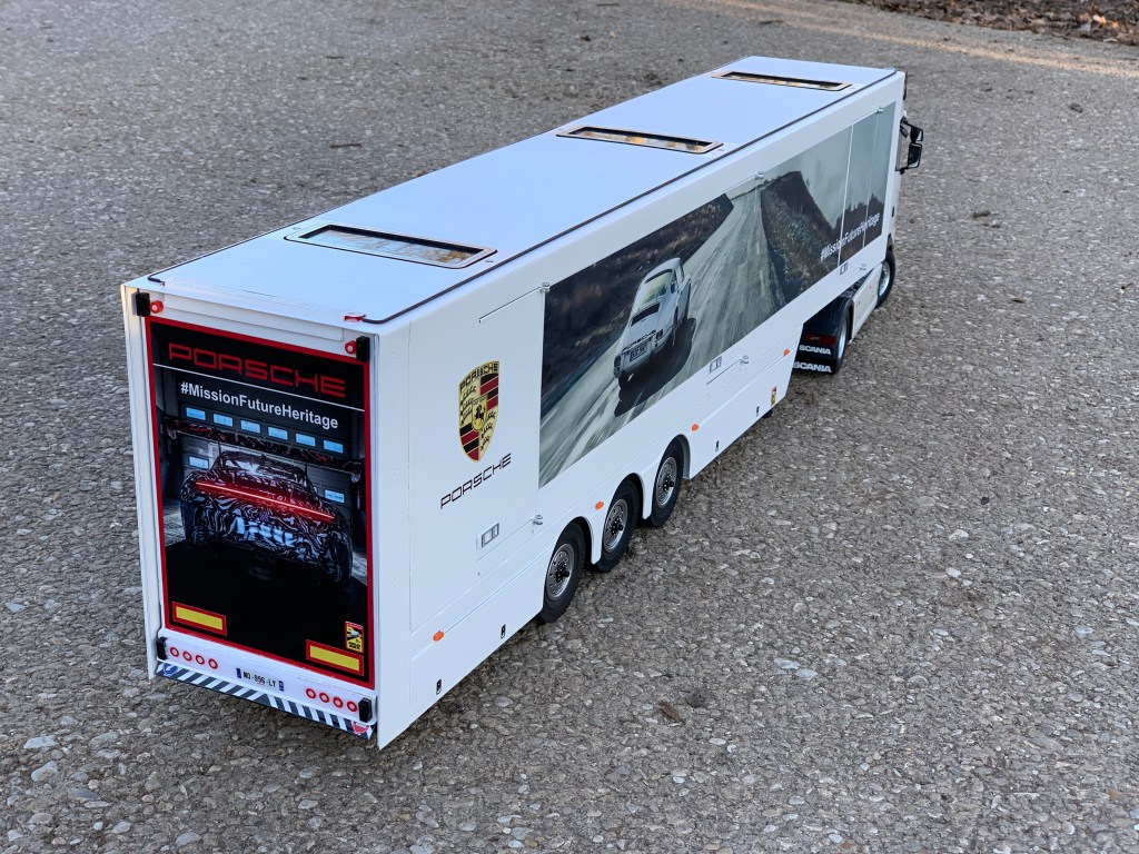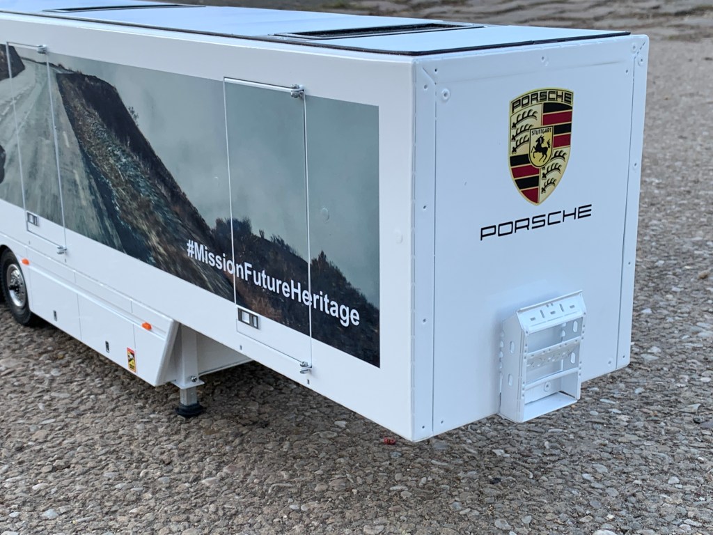 Ce n’est pas tous les jours que l’on fait réaliser une miniature sur-mesure… Voici l’histoire et la présentation d’un superbe semi-remorque aux couleurs de Porsche réalisé par MNtrailers.